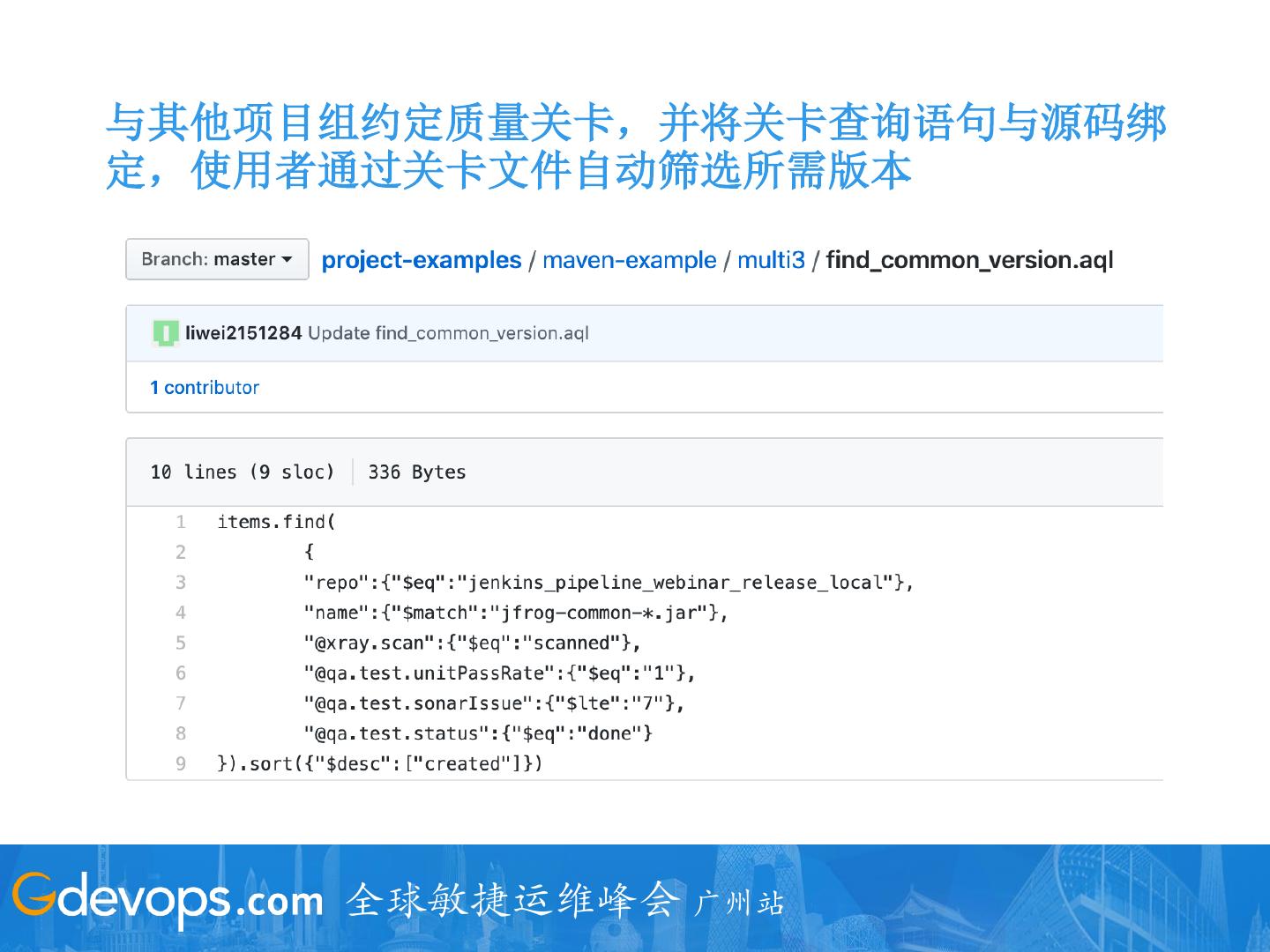 20 .与其他项目组约定质量关卡,并将关卡查询语句与源码绑 定,使用者通过关卡文件自动筛选所需版本 全球敏捷运维峰会 广州站