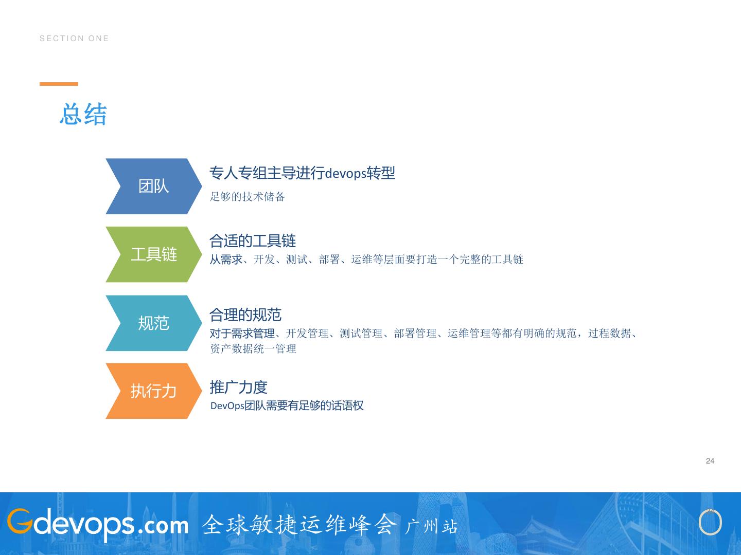 24 .SECTION ONE 总结 专人专组主导进行devops转型 团队 足够的技术储备 合适的工具链 工具链 从需求、开发、测试、部署、运维等层面要打造一个完整的工具链 合理的规范 规范 对于需求管理、开发管理、测试管理、部署管理、运维管理等都有明确的规范,过程数据、 资产数据统一管理 执行力 推广力度 DevOps团队需要有足够的话语权 24 全球敏捷运维峰会 广州站 24