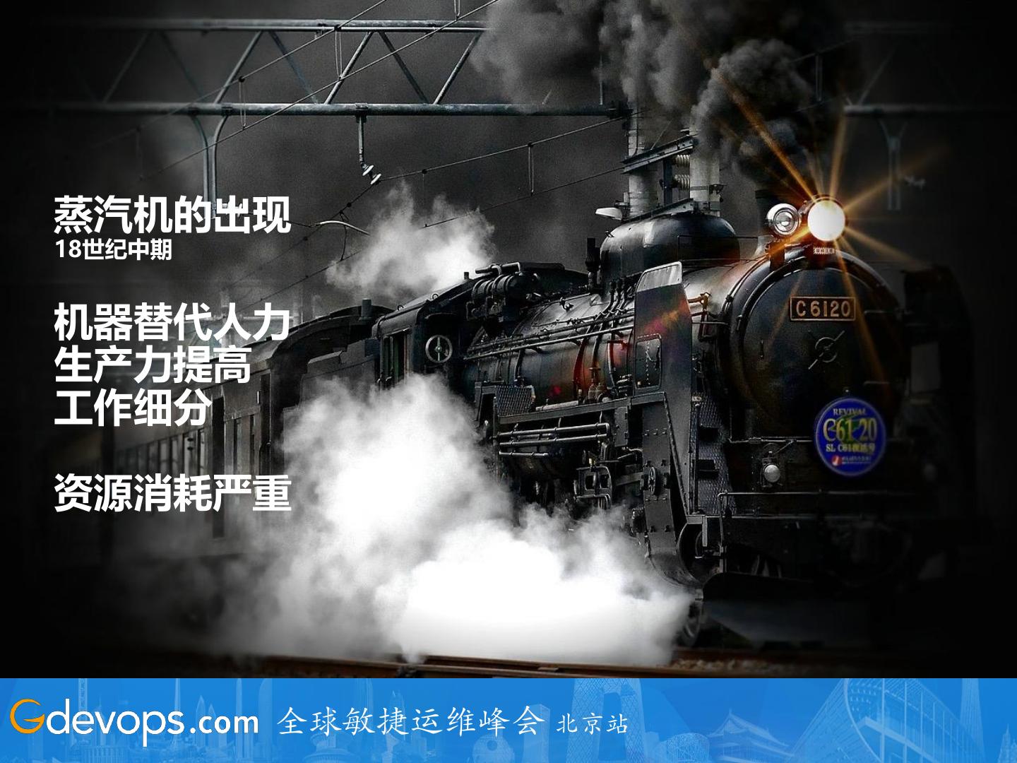 6 .蒸汽机的出现 18世纪中期 机器替代人力 生产力提高 工作细分 资源消耗严重 全球敏捷运维峰会 北京站