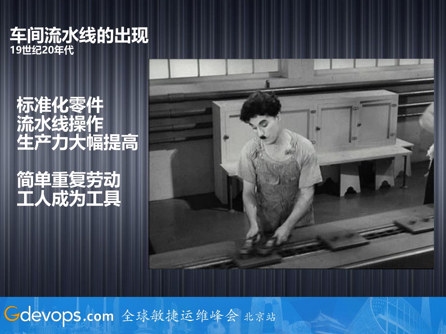 7 .车间流水线的出现 19世纪20年代 标准化零件 流水线操作 生产力大幅提高 简单重复劳动 工人成为工具 全球敏捷运维峰会 北京站