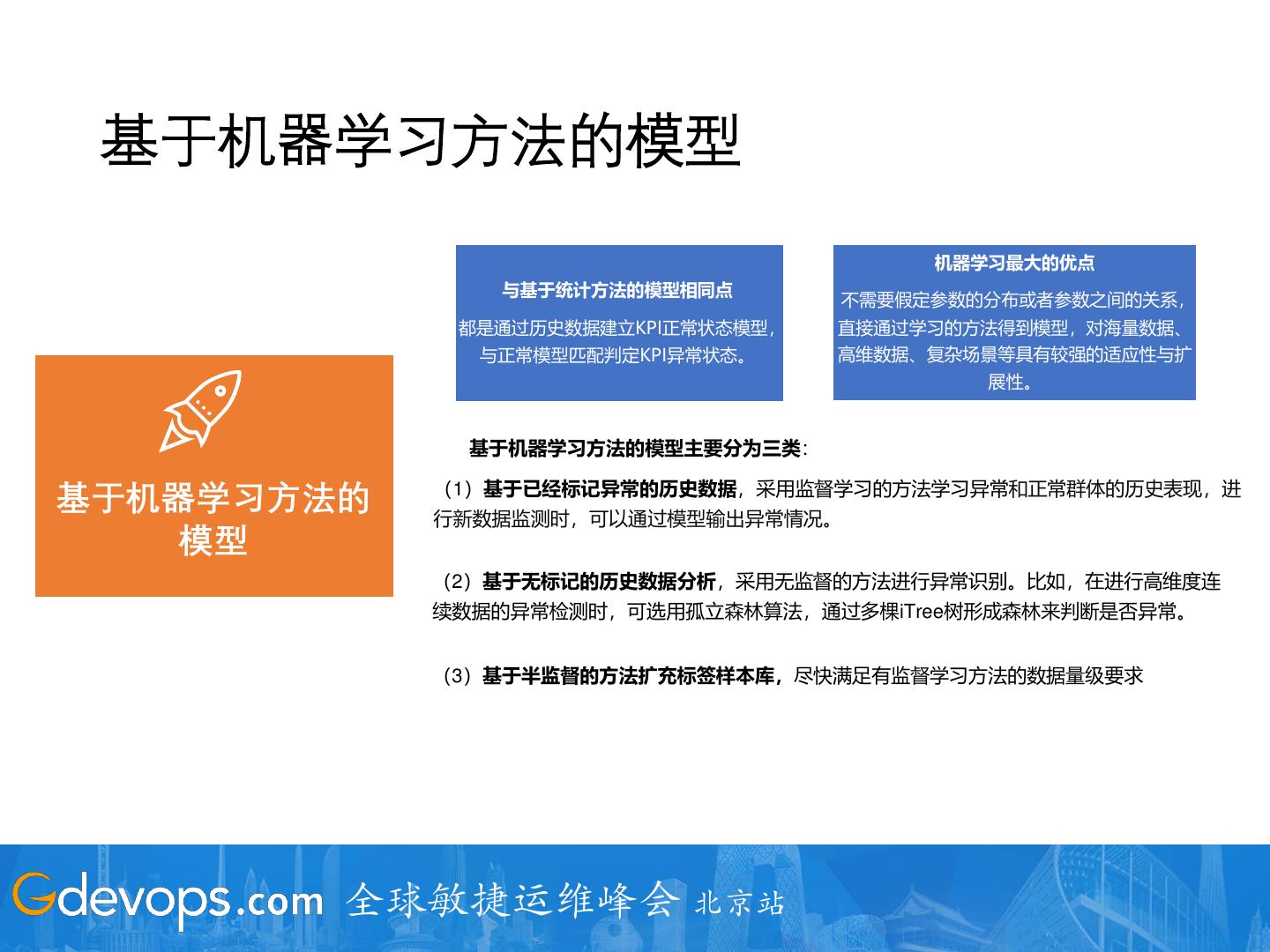 25 . 基于机器学习方法的模型 机器学习最大的优点 与基于统计方法的模型相同点 不需要假定参数的分布或者参数之间的关系, 都是通过历史数据建立KPI正常状态模型, 直接通过学习的方法得到模型,对海量数据、 与正常模型匹配判定KPI异常状态。 高维数据、复杂场景等具有较强的适应性与扩 展性。 基于机器学习方法的模型主要分为三类: (1)基于已经标记异常的历史数据,采用监督学习的方法学习异常和正常群体的历史表现,进 基于机器学习方法的 行新数据监测时,可以通过模型输出异常情况。 模型 (2)基于无标记的历史数据分析,采用无监督的方法进行异常识别。比如,在进行高维度连 续数据的异常检测时,可选用孤立森林算法,通过多棵iTree树形成森林来判断是否异常。 (3)基于半监督的方法扩充标签样本库,尽快满足有监督学习方法的数据量级要求 全球敏捷运维峰会 北京站