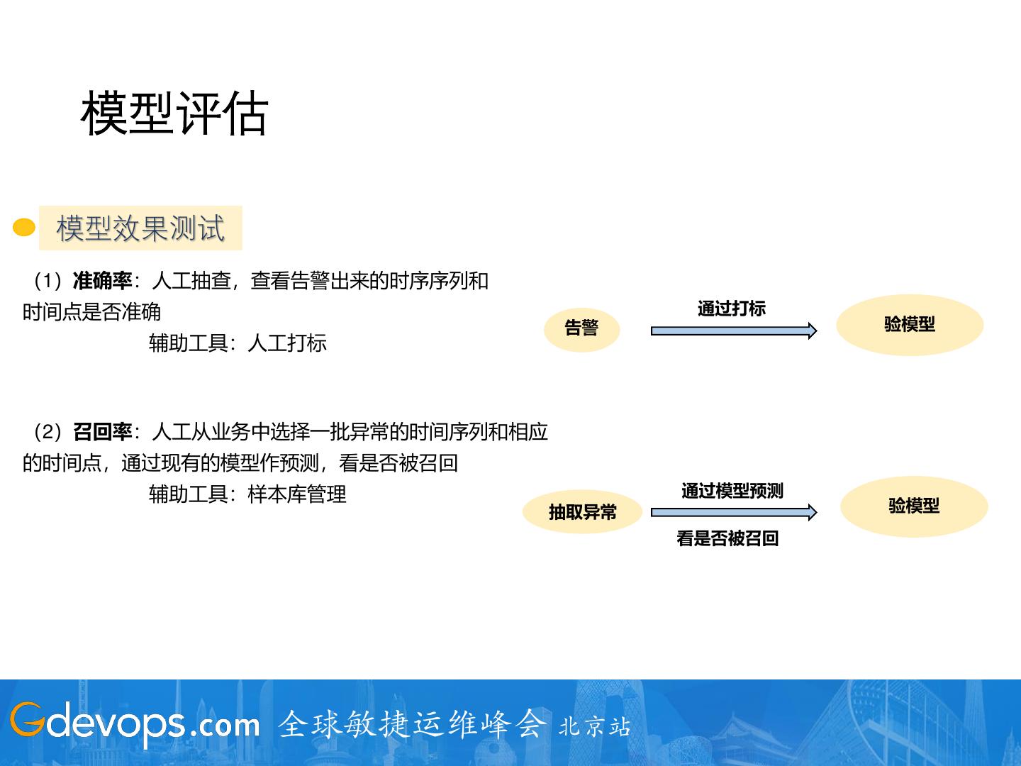 27 . 模型评估 模型效果测试 (1)准确率:人工抽查,查看告警出来的时序序列和 时间点是否准确 通过打标 告警 验模型 辅助工具:人工打标 (2)召回率:人工从业务中选择一批异常的时间序列和相应 的时间点,通过现有的模型作预测,看是否被召回 辅助工具:样本库管理 通过模型预测 抽取异常 验模型 看是否被召回 全球敏捷运维峰会 北京站