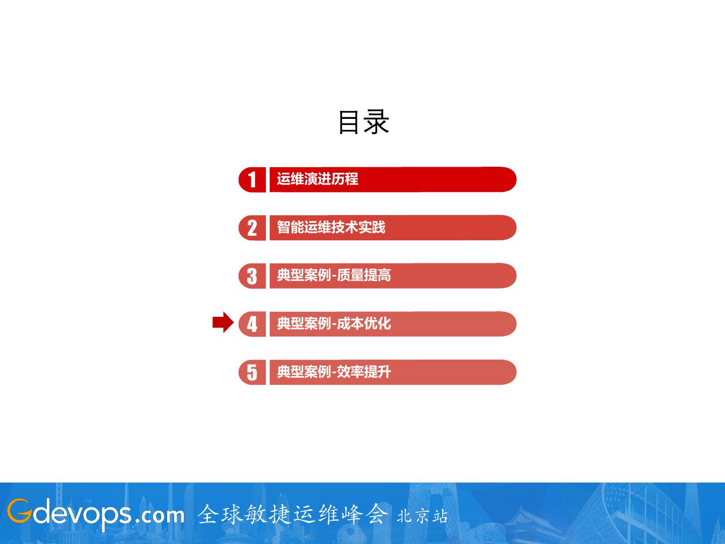 3 . 目录 1 运维演进历程 2 智能运维技术实践 3 典型案例-质量提高 4 典型案例-成本优化 5 典型案例-效率提升 全球敏捷运维峰会 北京站
