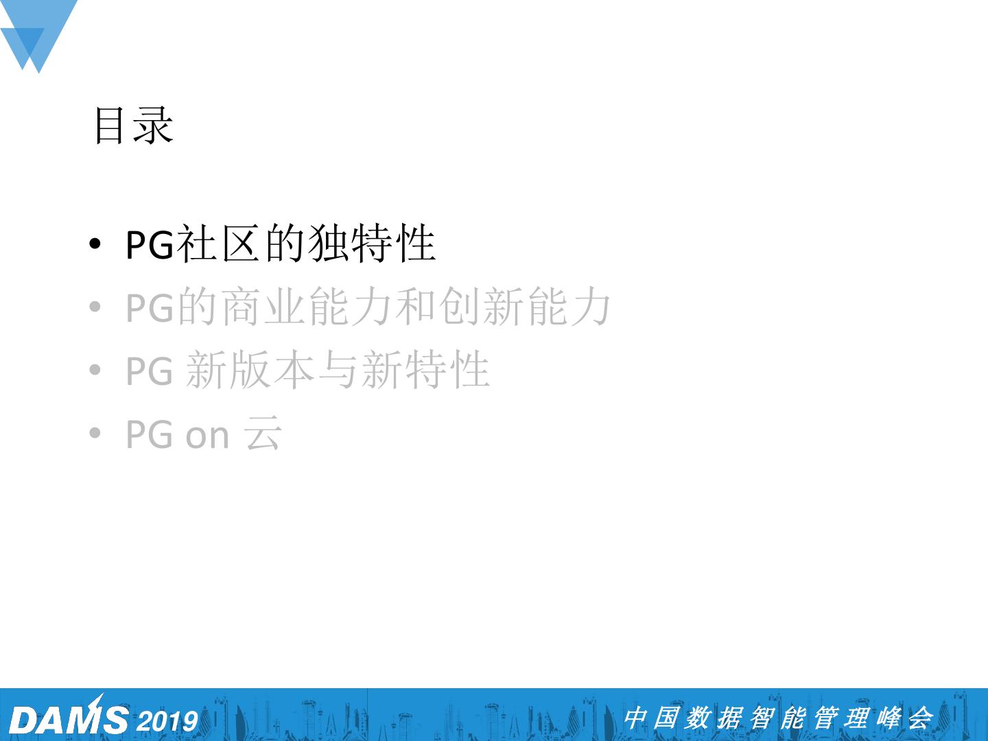 2 .目录 • PG社区的独特性 • PG的商业能力和创新能力 • PG 新版本与新特性 • PG on 云 2019 中国数据智能管理峰会