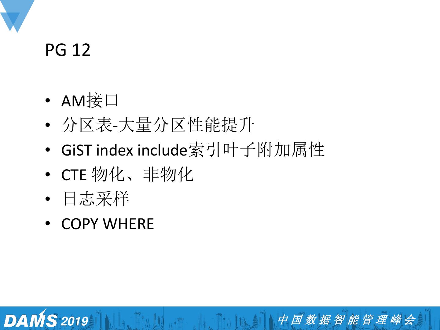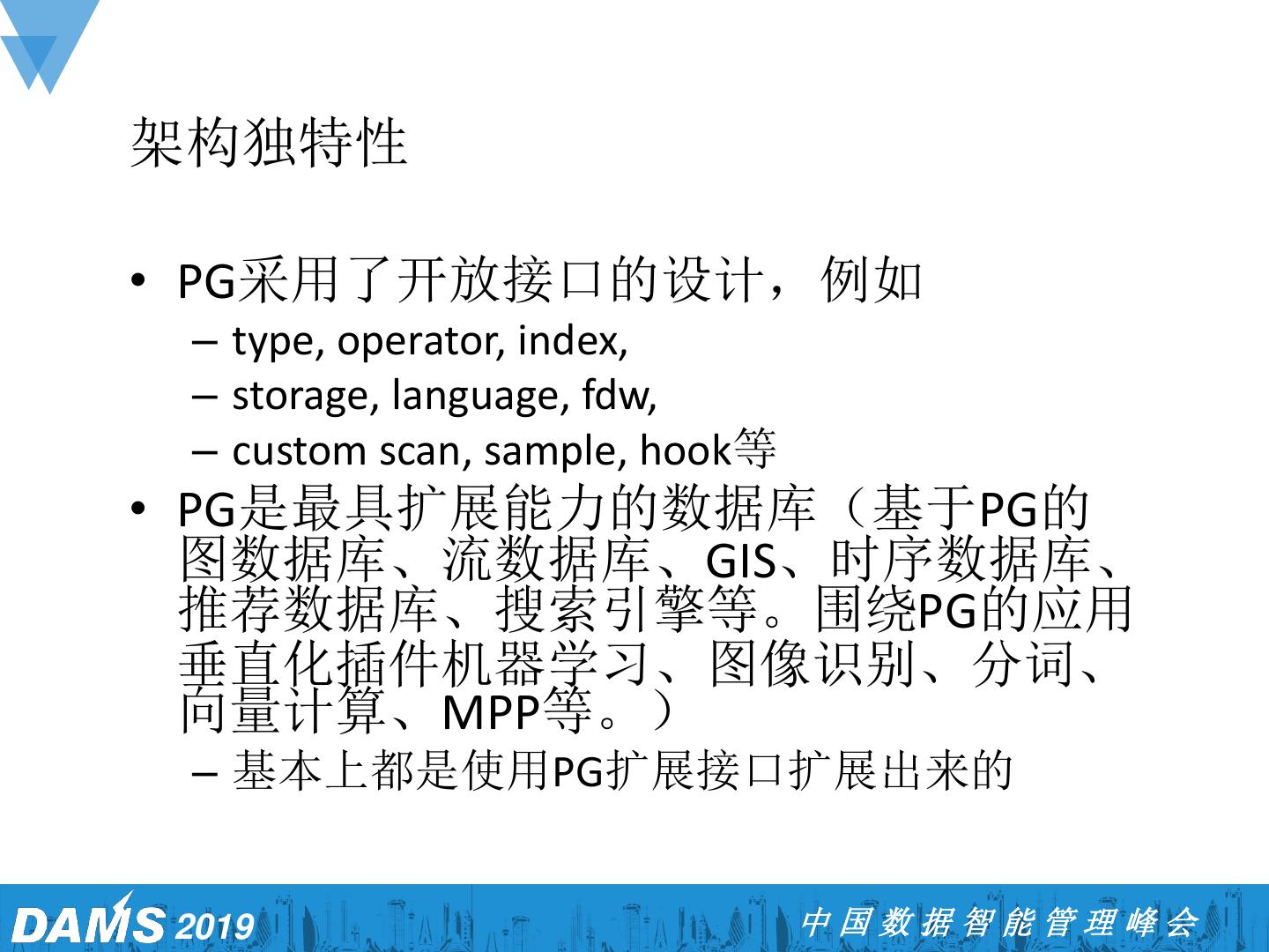 11 .架构独特性 • PG采用了开放接口的设计,例如 – type, operator, index, – storage, language, fdw, – custom scan, sample, hook等 • PG是最具扩展能力的数据库(基于PG的 图数据库、流数据库、GIS、时序数据库、 推荐数据库、搜索引擎等。围绕PG的应用 垂直化插件机器学习、图像识别、分词、 向量计算、MPP等。) – 基本上都是使用PG扩展接口扩展出来的 2019 中国数据智能管理峰会