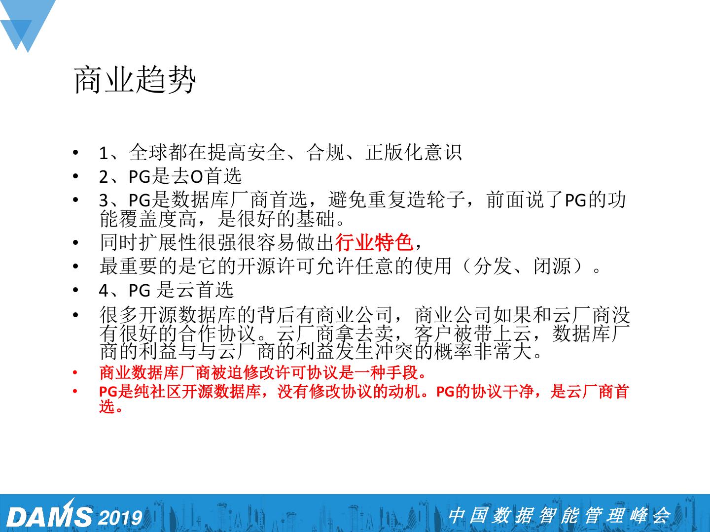 12 .商业趋势 • 1、全球都在提高安全、合规、正版化意识 • 2、PG是去O首选 • 3、PG是数据库厂商首选,避免重复造轮子,前面说了PG的功 能覆盖度高,是很好的基础。 • 同时扩展性很强很容易做出行业特色, • 最重要的是它的开源许可允许任意的使用(分发、闭源)。 • 4、PG 是云首选 • 很多开源数据库的背后有商业公司,商业公司如果和云厂商没 有很好的合作协议。云厂商拿去卖,客户被带上云,数据库厂 商的利益与与云厂商的利益发生冲突的概率非常大。 • 商业数据库厂商被迫修改许可协议是一种手段。 • PG是纯社区开源数据库,没有修改协议的动机。PG的协议干净,是云厂商首 选。 2019 中国数据智能管理峰会