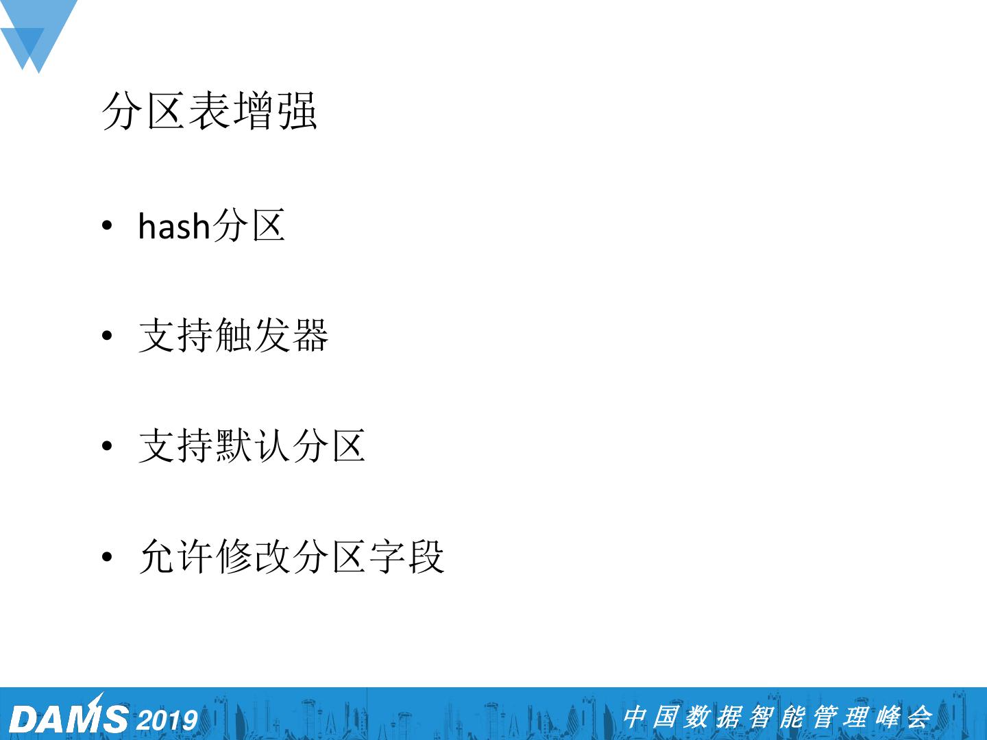 19 .分区表增强 • hash分区 • 支持触发器 • 支持默认分区 • 允许修改分区字段 2019 中国数据智能管理峰会