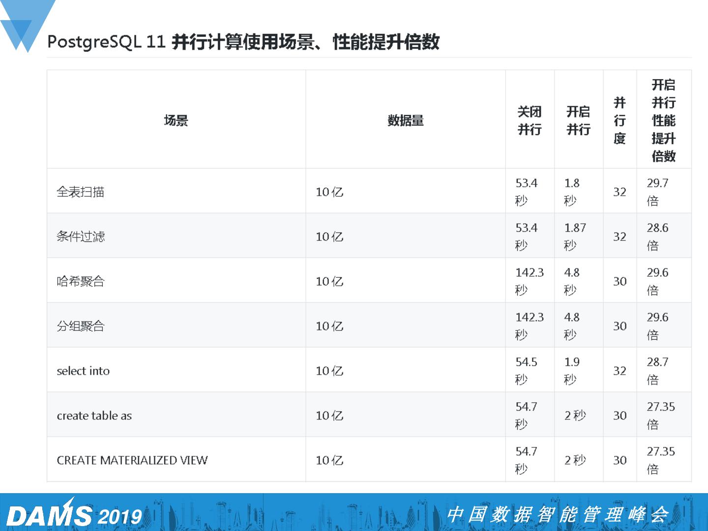 18 .PG 11 • 分区表增强 • 并行计算增强 • btree index include索引叶子附加属性 • 添加字段(含默认值)更快 • 支持存储过程 2019 中国数据智能管理峰会
