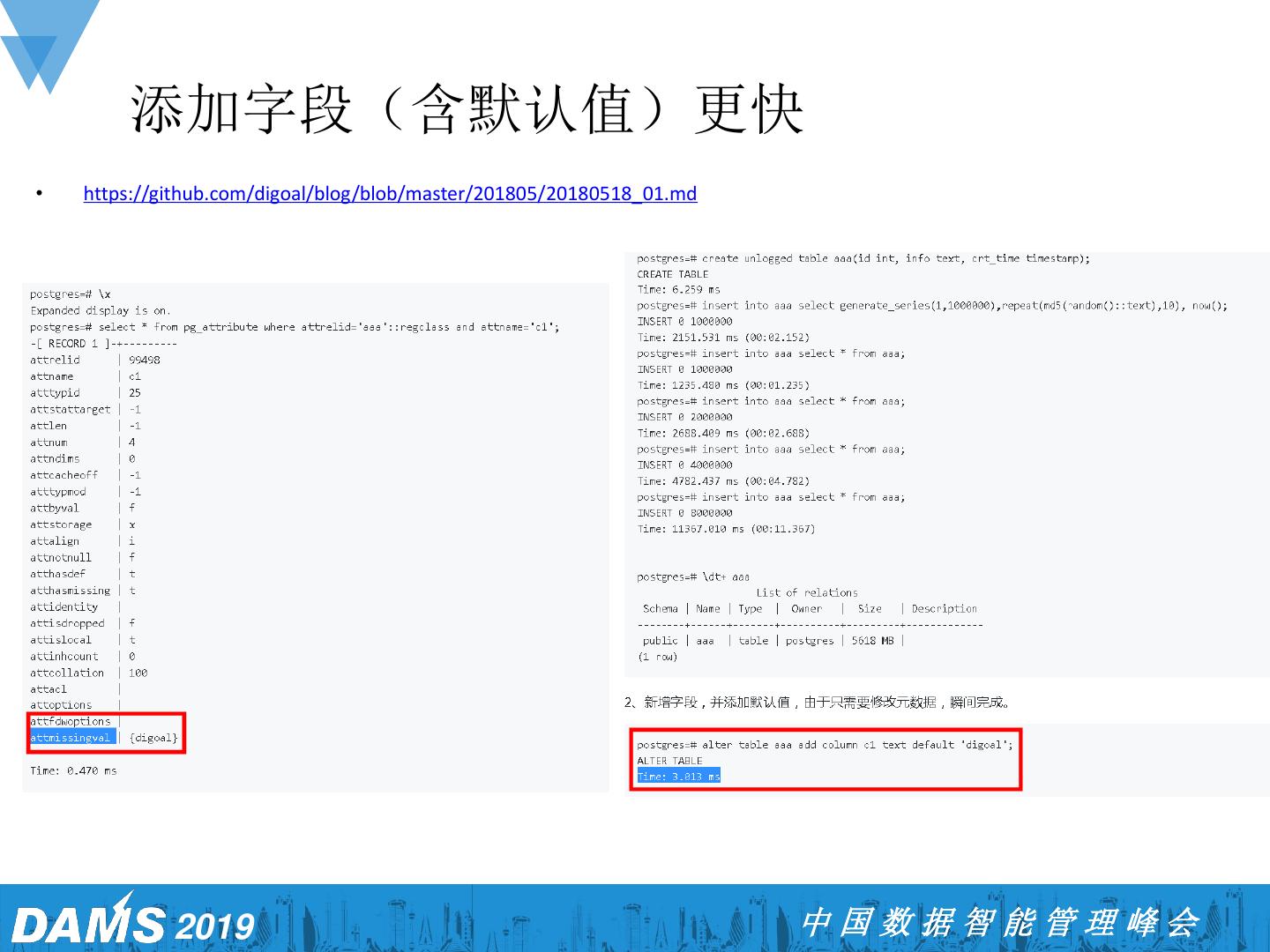 26 . 添加字段(含默认值)更快 • https://github.com/digoal/blog/blob/master/201805/20180518_01.md 2019 中国数据智能管理峰会