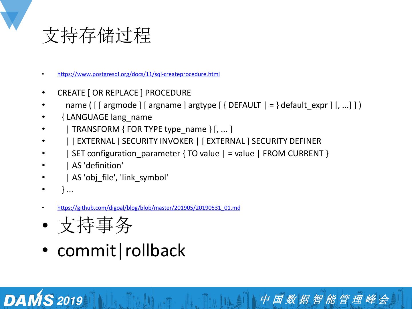 27 .支持存储过程 • https://www.postgresql.org/docs/11/sql-createprocedure.html • CREATE [ OR REPLACE ] PROCEDURE • name ( [ [ argmode ] [ argname ] argtype [ { DEFAULT | = } default_expr ] [, ...] ] ) • { LANGUAGE lang_name • | TRANSFORM { FOR TYPE type_name } [, ... ] • | [ EXTERNAL ] SECURITY INVOKER | [ EXTERNAL ] SECURITY DEFINER • | SET configuration_parameter { TO value | = value | FROM CURRENT } • | AS 'definition' • | AS 'obj_file', 'link_symbol' • } ... • https://github.com/digoal/blog/blob/master/201905/20190531_01.md • 支持事务 • commit|rollback 2019 中国数据智能管理峰会