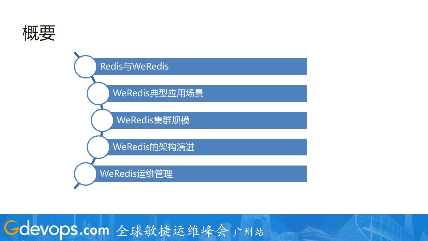 2 .概要 Redis与WeRedis WeRedis典型应用场景 WeRedis集群规模 WeRedis的架构演进 WeRedis运维管理 全球敏捷运维峰会 广州站 2