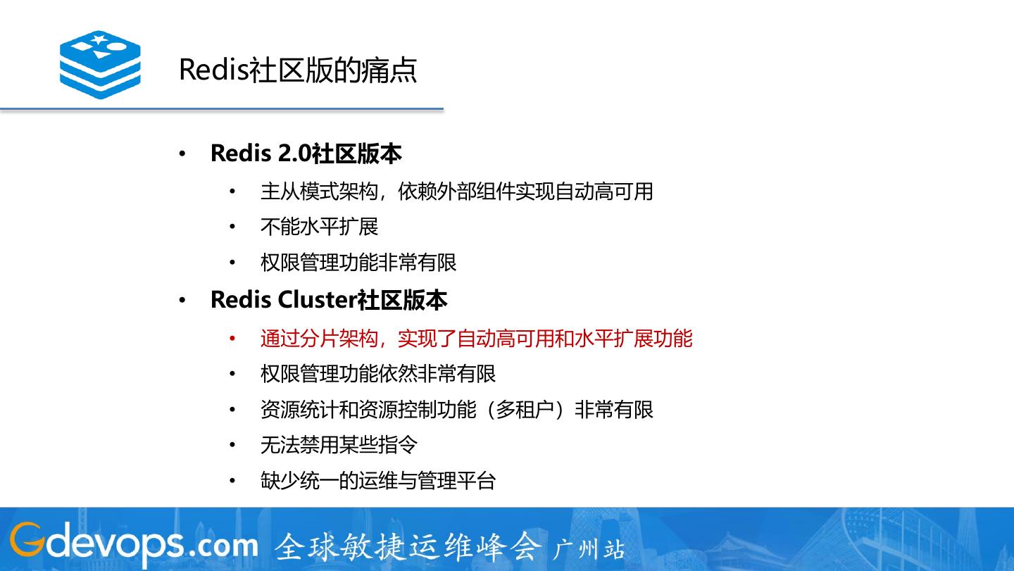3 .Redis社区版的痛点 • Redis 2.0社区版本 • 主从模式架构,依赖外部组件实现自动高可用 • 不能水平扩展 • 权限管理功能非常有限 • Redis Cluster社区版本 • 通过分片架构,实现了自动高可用和水平扩展功能 • 权限管理功能依然非常有限 • 资源统计和资源控制功能(多租户)非常有限 • 无法禁用某些指令 • 缺少统一的运维与管理平台 全球敏捷运维峰会 广州站 3