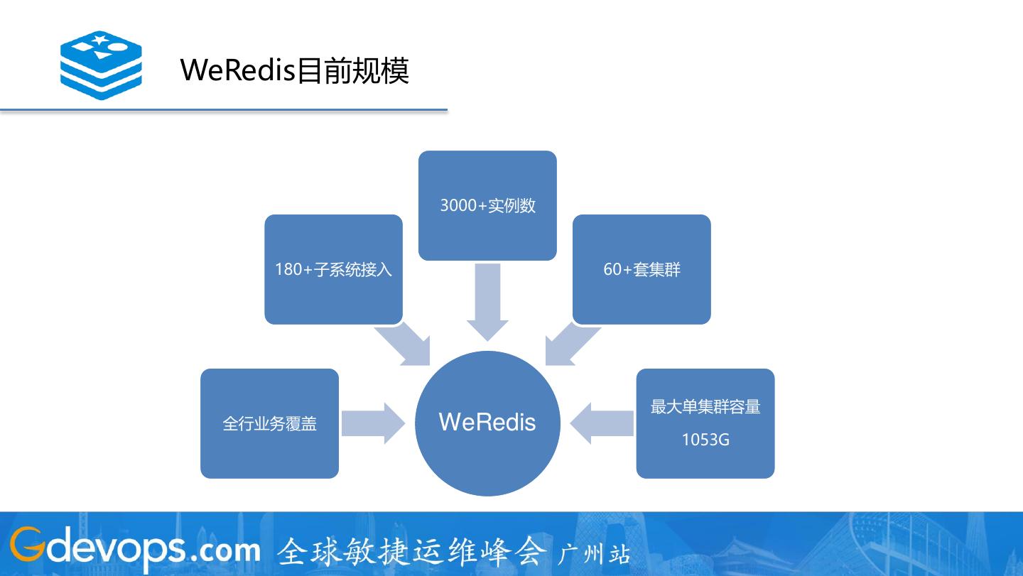 6 .WeRedis目前规模 3000+实例数 180+子系统接入 60+套集群 最大单集群容量 全行业务覆盖 WeRedis 1053G 全球敏捷运维峰会 广州站 6