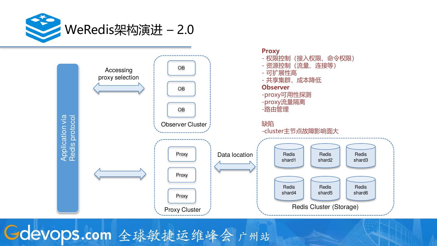8 . WeRedis架构演进 – 2.0 Proxy - 权限控制(接入权限、命令权限) OB - 资源控制(流量、连接等) Accessing - 可扩展性高 proxy selection - 共享集群,成本降低 OB Observer -proxy可用性探测 -proxy流量隔离 OB -路由管理 Application via Redis protocol Observer Cluster 缺陷 -cluster主节点故障影响面大 Proxy Data location Redis Redis Redis shard1 shard2 shard3 Proxy Redis Redis Redis shard4 shard5 shard6 Proxy Proxy Cluster Redis Cluster (Storage) 全球敏捷运维峰会 广州站 8
