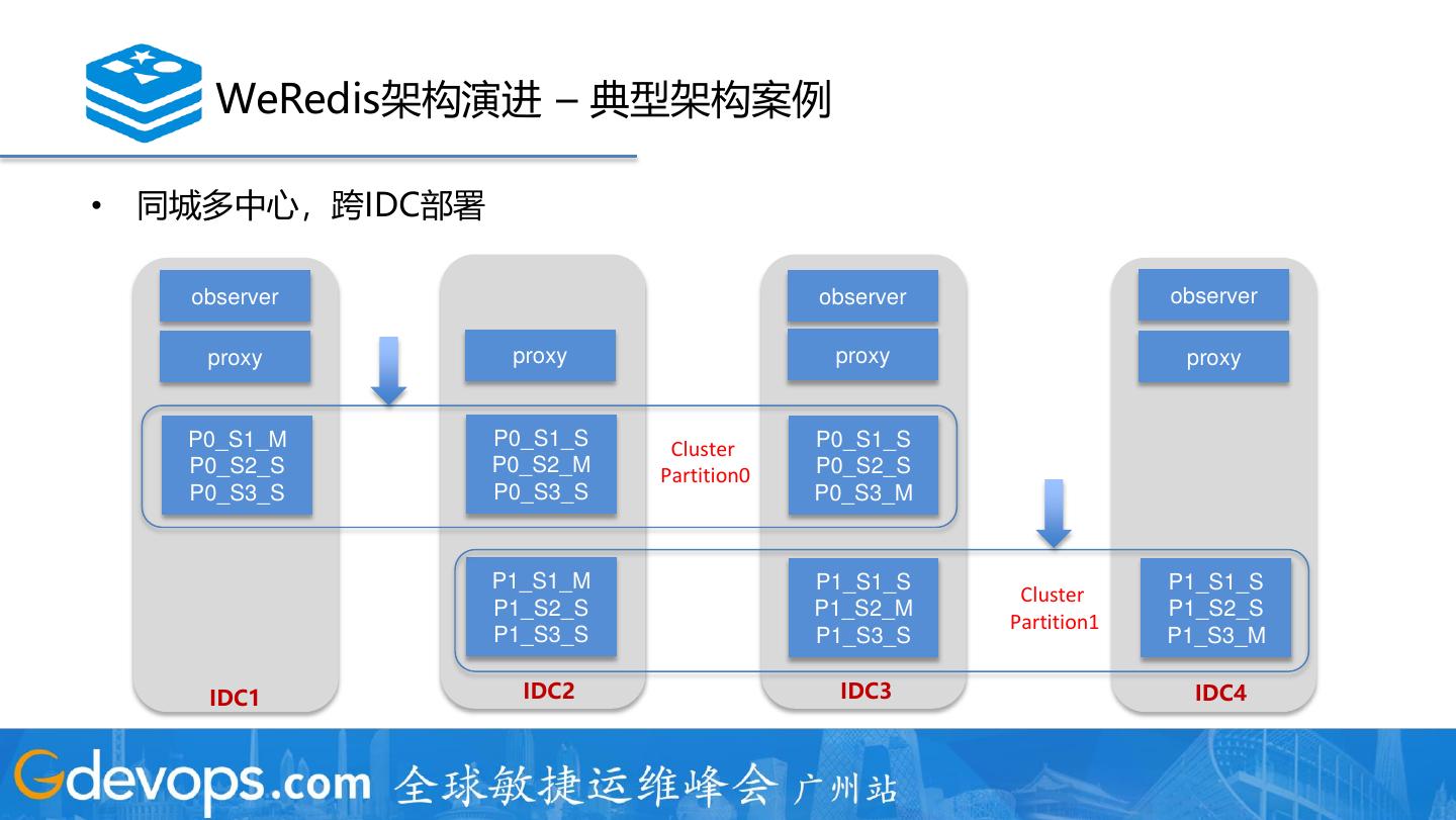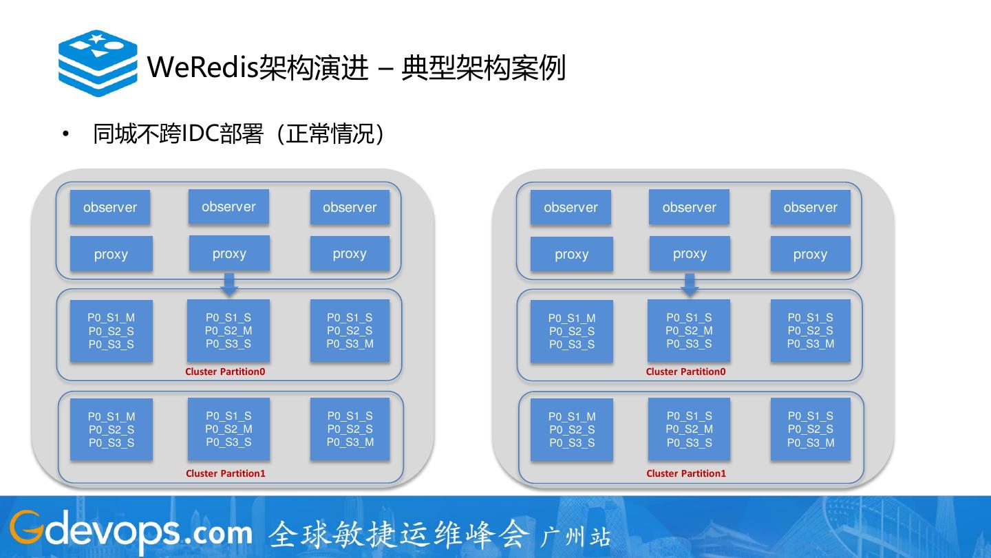 12 . WeRedis架构演进 – 典型架构案例 • 同城不跨IDC部署(正常情况) observer observer observer observer observer observer proxy proxy proxy proxy proxy proxy P0_S1_M P0_S1_S P0_S1_S P0_S1_M P0_S1_S P0_S1_S P0_S2_S P0_S2_M P0_S2_S P0_S2_S P0_S2_M P0_S2_S P0_S3_S P0_S3_S P0_S3_M P0_S3_S P0_S3_S P0_S3_M Cluster Partition0 Cluster Partition0 P0_S1_M P0_S1_S P0_S1_S P0_S1_M P0_S1_S P0_S1_S P0_S2_S P0_S2_M P0_S2_S P0_S2_S P0_S2_M P0_S2_S P0_S3_S P0_S3_S P0_S3_M P0_S3_S P0_S3_S P0_S3_M Cluster Partition1 Cluster Partition1 全球敏捷运维峰会 广州站 12