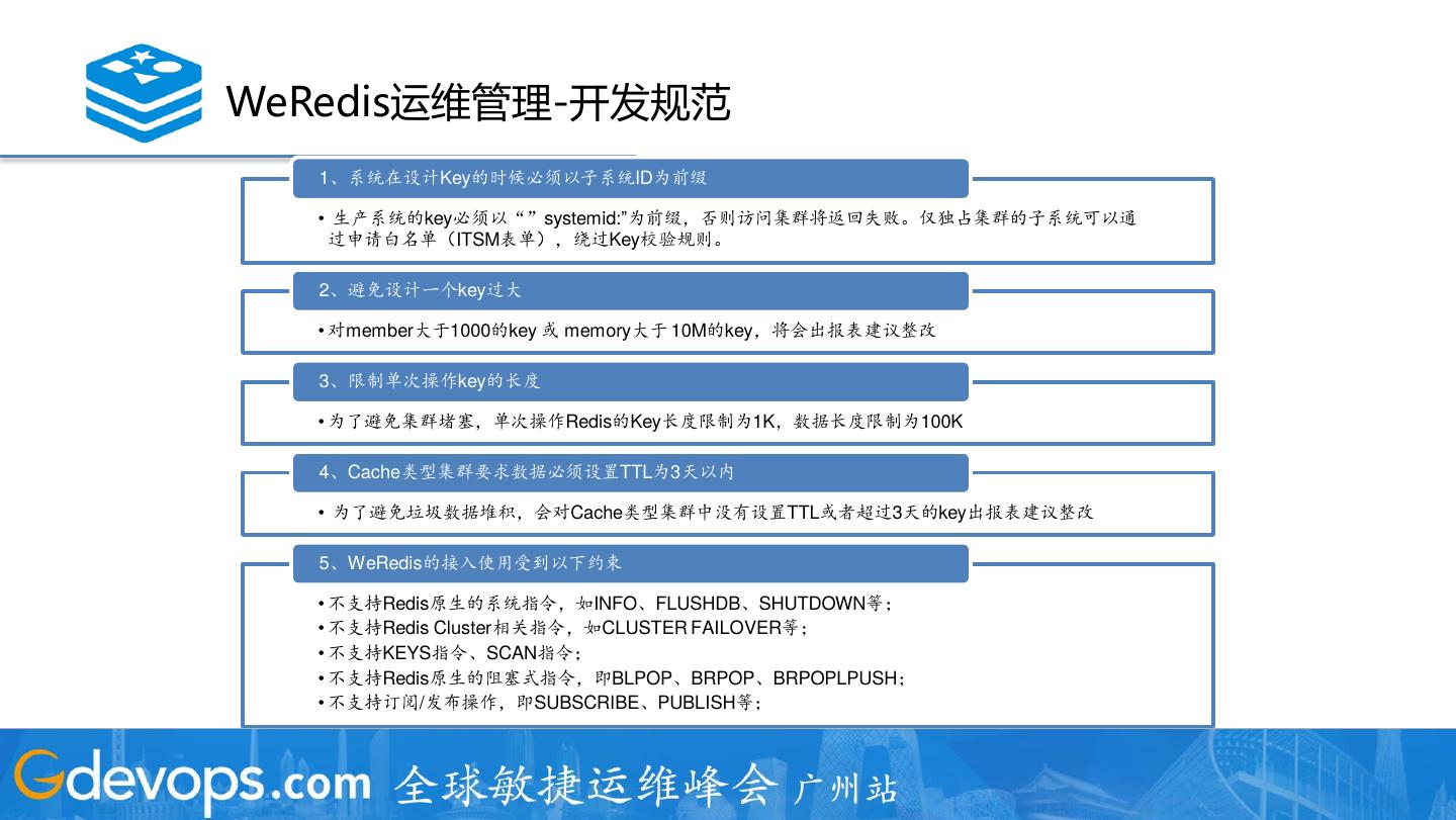 15 .WeRedis运维管理-开发规范 1、系统在设计Key的时候必须以子系统ID为前缀 • 生产系统的key必须以“”systemid:”为前缀,否则访问集群将返回失败。仅独占集群的子系统可以通 过申请白名单(ITSM表单),绕过Key校验规则。 2、避免设计一个key过大 • 对member大于1000的key 或 memory大于 10M的key,将会出报表建议整改 3、限制单次操作key的长度 • 为了避免集群堵塞,单次操作Redis的Key长度限制为1K,数据长度限制为100K 4、Cache类型集群要求数据必须设置TTL为3天以内 • 为了避免垃圾数据堆积,会对Cache类型集群中没有设置TTL或者超过3天的key出报表建议整改 5、WeRedis的接入使用受到以下约束 • 不支持Redis原生的系统指令,如INFO、FLUSHDB、SHUTDOWN等; • 不支持Redis Cluster相关指令,如CLUSTER FAILOVER等; • 不支持KEYS指令、SCAN指令; • 不支持Redis原生的阻塞式指令,即BLPOP、BRPOP、BRPOPLPUSH; • 不支持订阅/发布操作,即SUBSCRIBE、PUBLISH等; 全球敏捷运维峰会 广州站 15