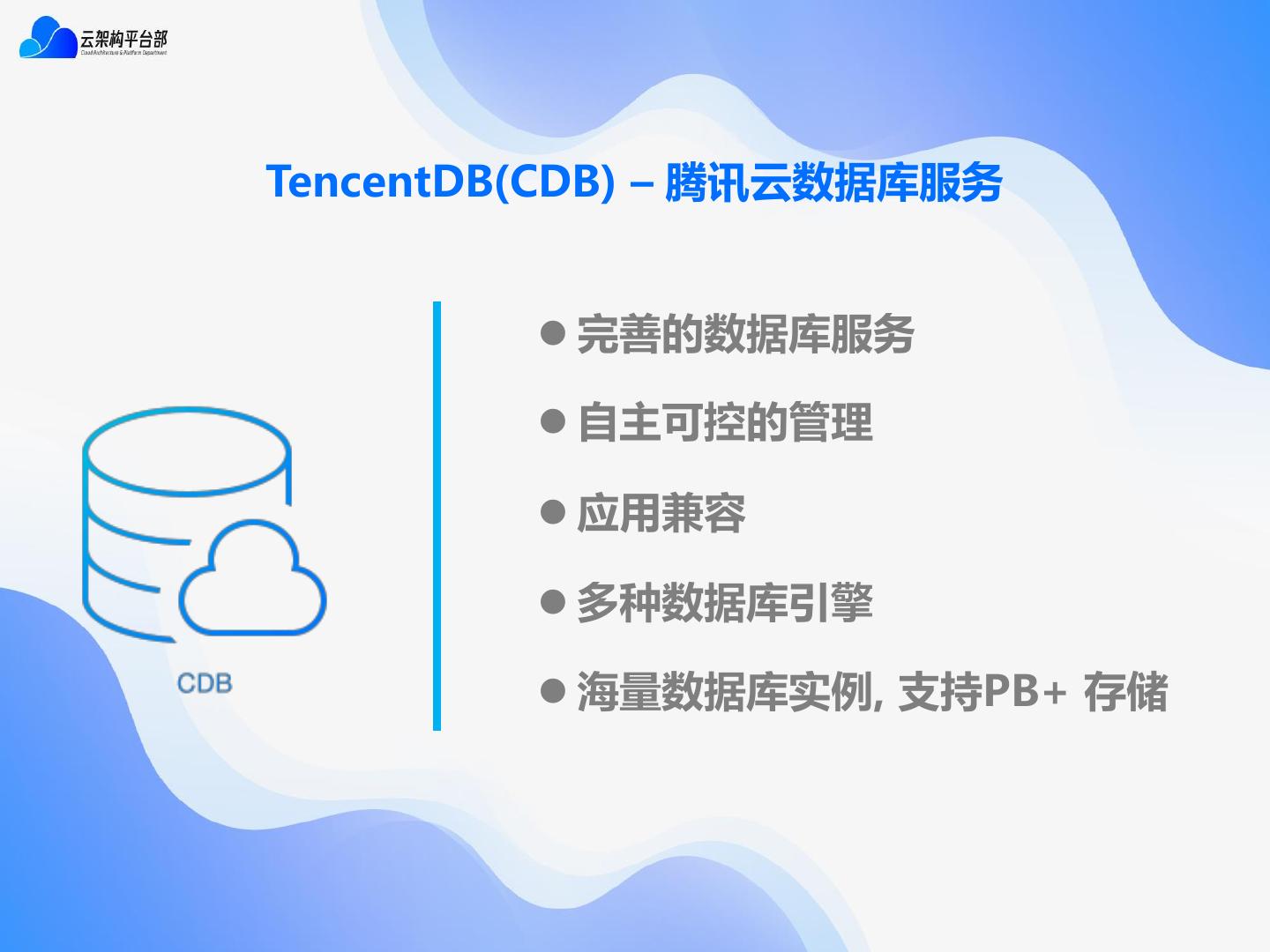 5 .TencentDB(CDB) – 腾讯云数据库服务 ⚫ 完善的数据库服务 ⚫ 自主可控的管理 ⚫ 应用兼容 ⚫ 多种数据库引擎 ⚫ 海量数据库实例, 支持PB+ 存储