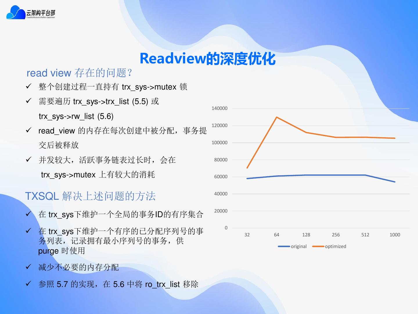 12 . Readview的深度优化 read view 存在的问题? ✓ 整个创建过程一直持有 trx_sys->mutex 锁 ✓ 需要遍历 trx_sys->trx_list (5.5) 或 140000 trx_sys->rw_list (5.6) 120000 ✓ read_view 的内存在每次创建中被分配,事务提 100000 交后被释放 ✓ 并发较大,活跃事务链表过长时,会在 80000 trx_sys->mutex 上有较大的消耗 60000 TXSQL 解决上述问题的方法 40000 20000 ✓ 在 trx_sys下维护一个全局的事务ID的有序集合 0 ✓ 在 trx_sys下维护一个有序的已分配序列号的事 32 64 128 256 512 1000 务列表,记录拥有最小序列号的事务,供 original optimized purge 时使用 ✓ 减少不必要的内存分配 ✓ 参照 5.7 的实现,在 5.6 中将 ro_trx_list 移除