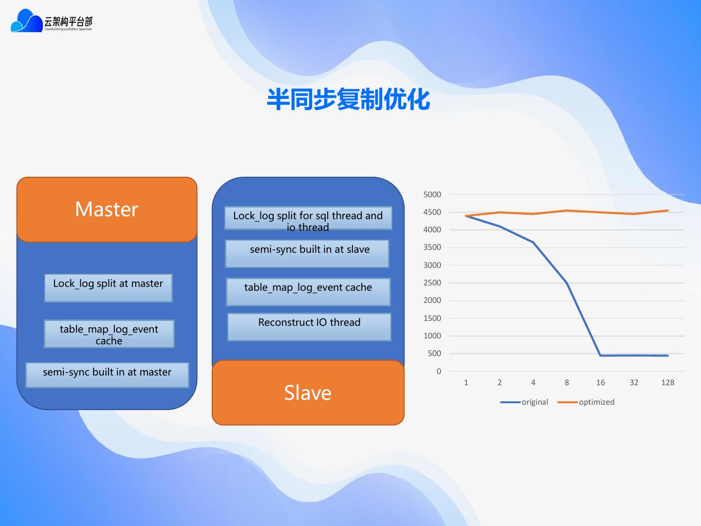 13 . 半同步复制优化 5000 Master Lock_log split for sql thread and 4500 io thread 4000 semi-sync built in at slave 3500 3000 Lock_log split at master table_map_log_event cache 2500 2000 1500 Reconstruct IO thread table_map_log_event 1000 cache 500 semi-sync built in at master 0 1 2 4 8 16 32 128 Slave original optimized
