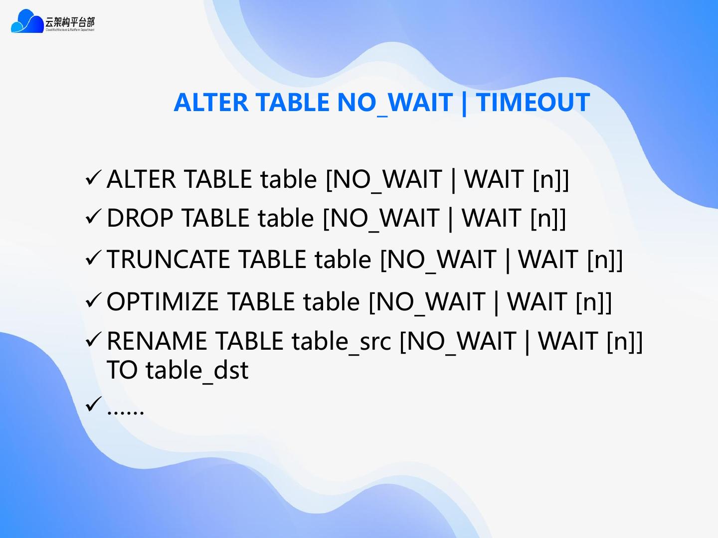 18 . ALTER TABLE NO_WAIT | TIMEOUT ✓ ALTER TABLE table [NO_WAIT | WAIT [n]] ✓ DROP TABLE table [NO_WAIT | WAIT [n]] ✓ TRUNCATE TABLE table [NO_WAIT | WAIT [n]] ✓ OPTIMIZE TABLE table [NO_WAIT | WAIT [n]] ✓ RENAME TABLE table_src [NO_WAIT | WAIT [n]] TO table_dst ✓ ……