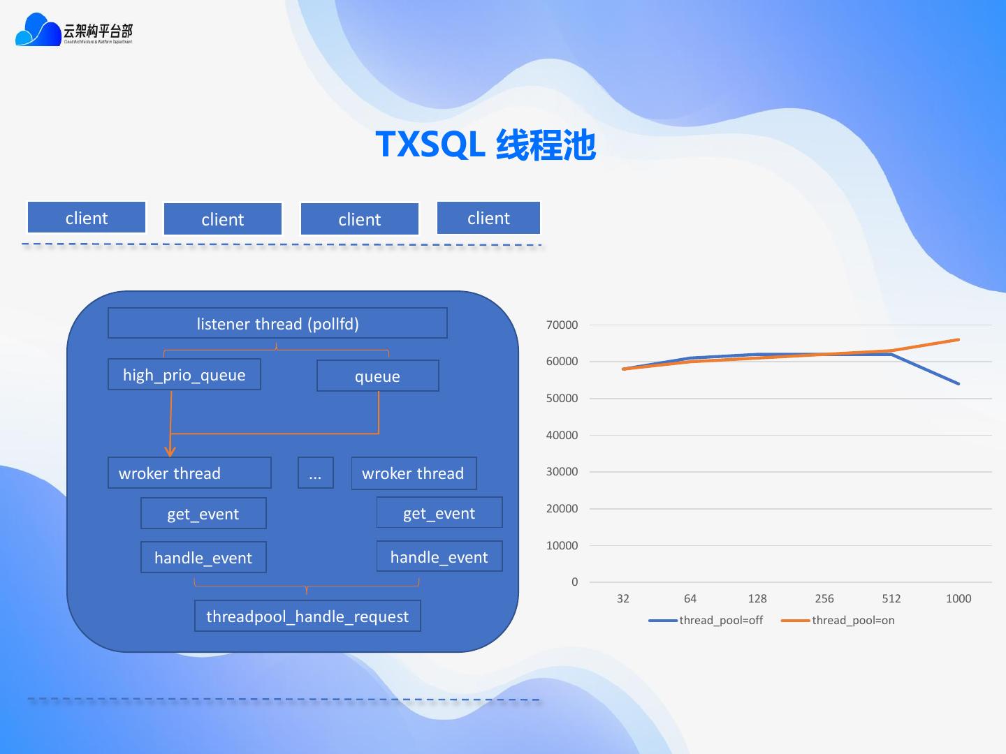 21 . TXSQL 线程池 client client client client listener thread (pollfd) 70000 60000 high_prio_queue queue 50000 40000 wroker thread ... wroker thread 30000 get_event 20000 get_event 10000 handle_event handle_event 0 32 64 128 256 512 1000 threadpool_handle_request thread_pool=off thread_pool=on