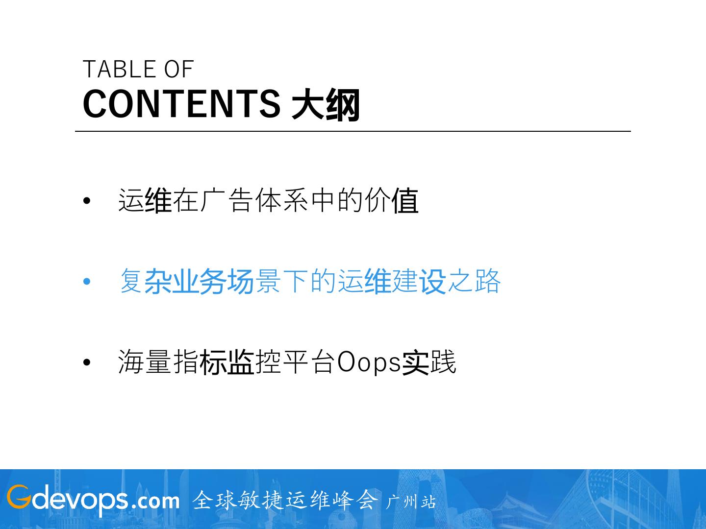 3 .TABLE OF CONTENTS 大纲 • 运维在广告体系中的价值 • 复杂业务场景下的运维建设之路 • 海量指标监控平台Oops实践 全球敏捷运维峰会 广州站
