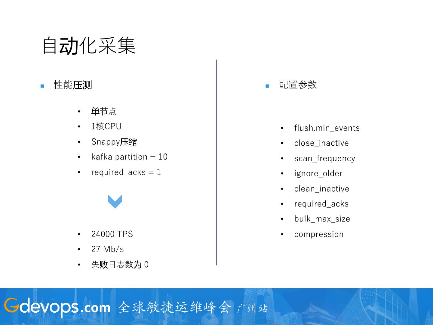 26 .自动化采集 ◼ 性能压测 ◼ 配置参数 • 单节点 • 1核CPU • flush.min_events • Snappy压缩 • close_inactive • kafka partition = 10 • scan_frequency • required_acks = 1 • ignore_older • clean_inactive • required_acks • bulk_max_size • 24000 TPS • compression • 27 Mb/s • 失败日志数为 0 全球敏捷运维峰会 广州站