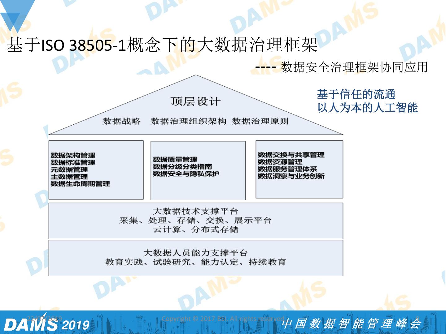 9 .基于ISO 38505-1概念下的大数据治理框架 ---- 数据安全治理框架协同应用 基于信任的流通 以人为本的人工智能 22/07/2019 Copyright © 2017 BSI. All rights reserved 9 2019 中国数据智能管理峰会