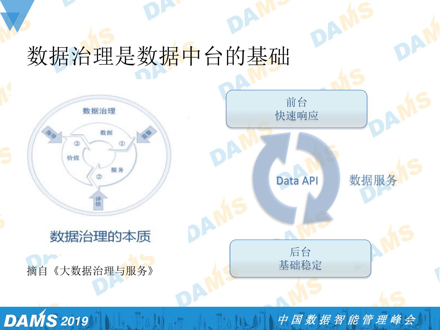 12 .数据治理是数据中台的基础 前台 快速响应 Data API 数据服务 后台 基础稳定 摘自《大数据治理与服务》 2019 中国数据智能管理峰会