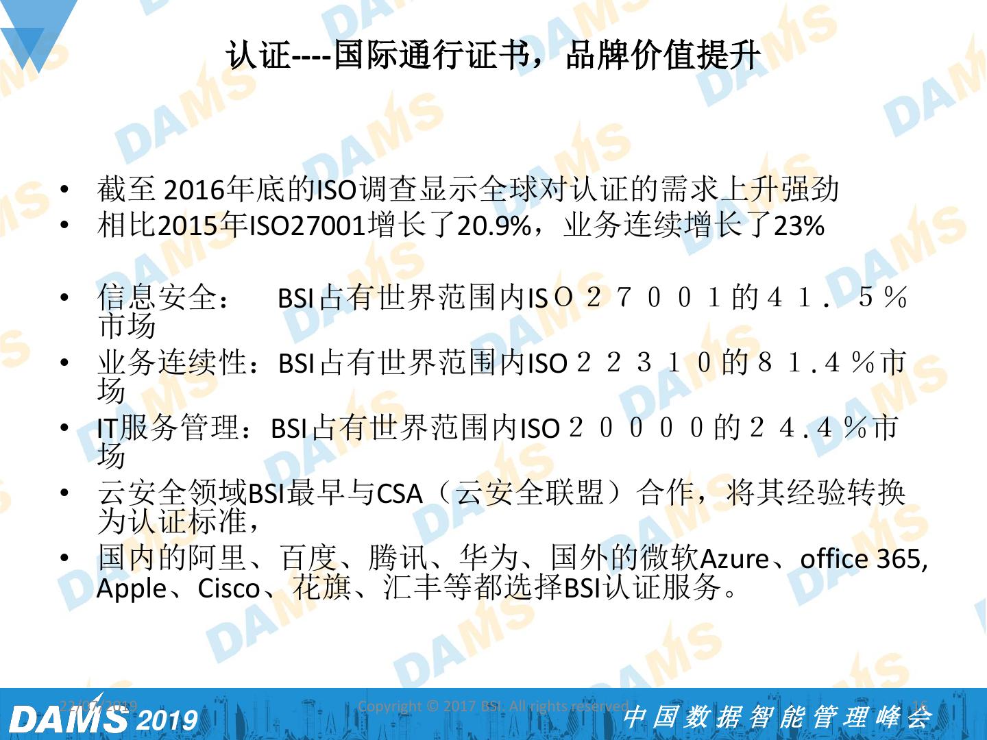 16 . 认证----国际通行证书,品牌价值提升 • 截至 2016年底的ISO调查显示全球对认证的需求上升强劲 • 相比2015年ISO27001增长了20.9%,业务连续增长了23% • 信息安全: BSI占有世界范围内ISO27001的41.5% 市场 • 业务连续性:BSI占有世界范围内ISO22310的81.4%市 场 • IT服务管理:BSI占有世界范围内ISO20000的24.4%市 场 • 云安全领域BSI最早与CSA(云安全联盟)合作,将其经验转换 为认证标准, • 国内的阿里、百度、腾讯、华为、国外的微软Azure、office 365, Apple、Cisco、花旗、汇丰等都选择BSI认证服务。 22/07/2019 Copyright © 2017 BSI. All rights reserved 16 2019 中国数据智能管理峰会