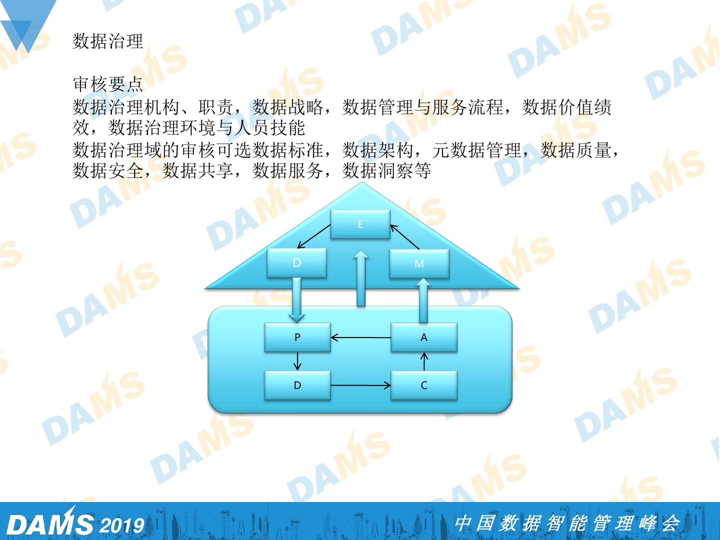 21 .数据治理 审核要点 数据治理机构、职责,数据战略,数据管理与服务流程,数据价值绩 效,数据治理环境与人员技能 数据治理域的审核可选数据标准,数据架构,元数据管理,数据质量, 数据安全,数据共享,数据服务,数据洞察等 E D M P A D C 2019 中国数据智能管理峰会