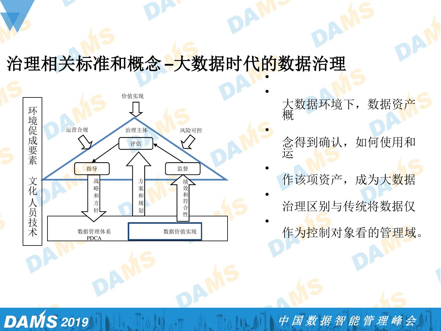 27 .治理相关标准和概念 –大数据时代的数据治理 • 价值实现 • 环 大数据环境下,数据资产 境 概 促 运营合规 治理主体 风险可控 • 成 评估 念得到确认,如何使用和 要 运 素 指导 监督 • 文 战 方 绩 作该项资产,成为大数据 略 案 效 化 和 和 和 • 人 方 规 符 合 治理区别与传统将数据仅 划 员 针 性 技 • 术 数据管理体系 PDCA 数据价值实现 作为控制对象看的管理域。 2019 中国数据智能管理峰会