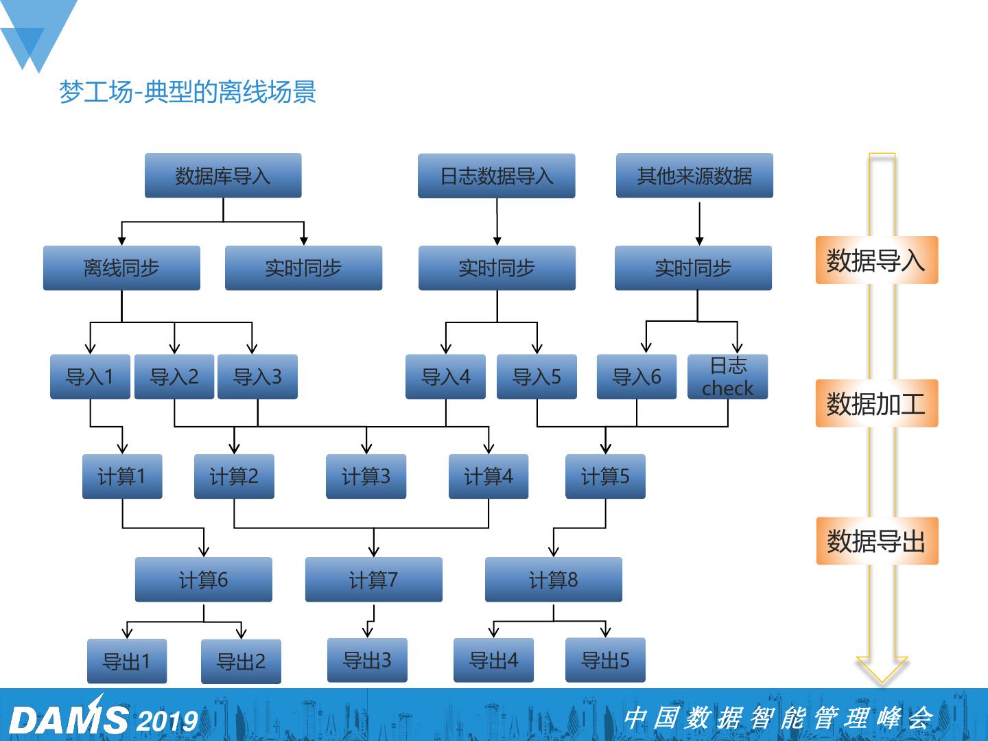19 .梦工场-业务下线 数据库导入 日志数据导入 其他来源数据 离线同步 实时同步 实时同步 实时同步 数据导入 日志 导入1 导入2 导入3 导入4 导入5 导入6 check 数据加工 计算1 计算2 计算3 计算4 计算5 数据导出 计算6 计算7 计算8 业务下线 导出1 导出2 导出3 导出4 导出5 2019 中国数据智能管理峰会