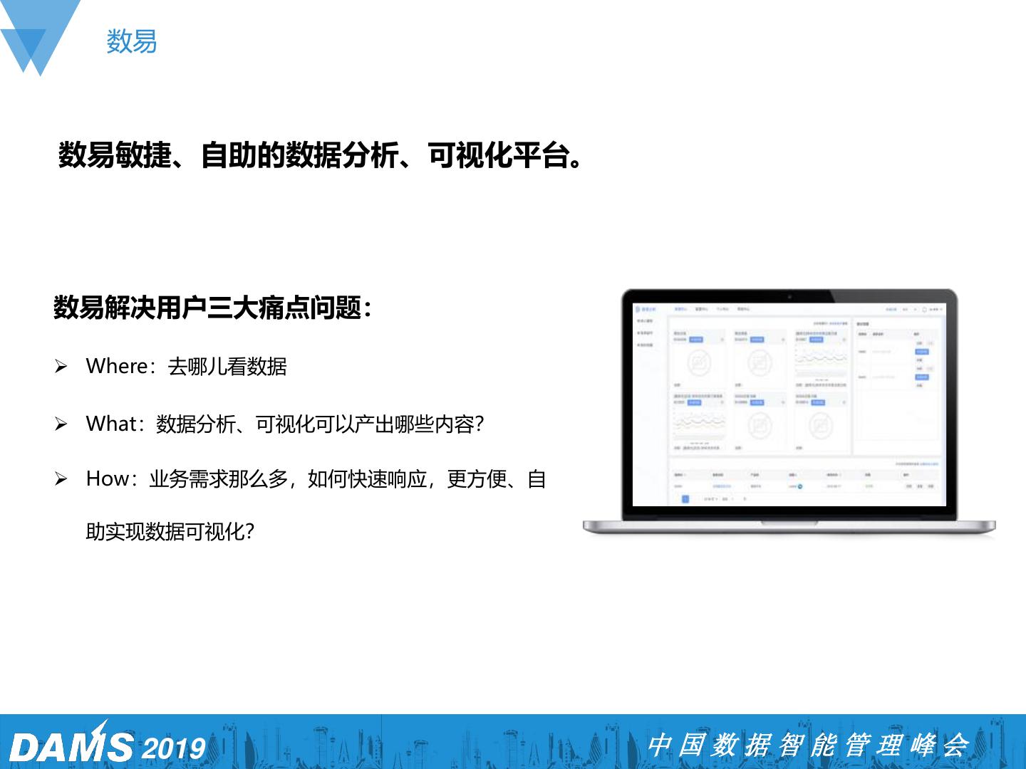 21 . 数易 数易敏捷、自助的数据分析、可视化平台。 数易解决用户三大痛点问题: ➢ Where:去哪儿看数据 ➢ What:数据分析、可视化可以产出哪些内容? ➢ How:业务需求那么多,如何快速响应,更方便、自 助实现数据可视化? 2019 中国数据智能管理峰会