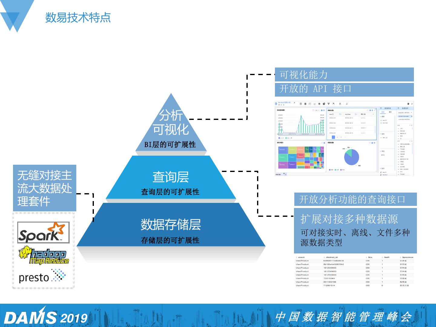 22 . 数易技术特点 可视化能力 开放的 API 接口 分析 可视化 BI层的可扩展性 无缝对接主 查询层 流大数据处 查询层的可扩展性 理套件 开放分析功能的查询接口 扩展对接多种数据源 数据存储层 可对接实时、离线、文件多种 存储层的可扩展性 源数据类型 2019 中国数据智能管理峰会