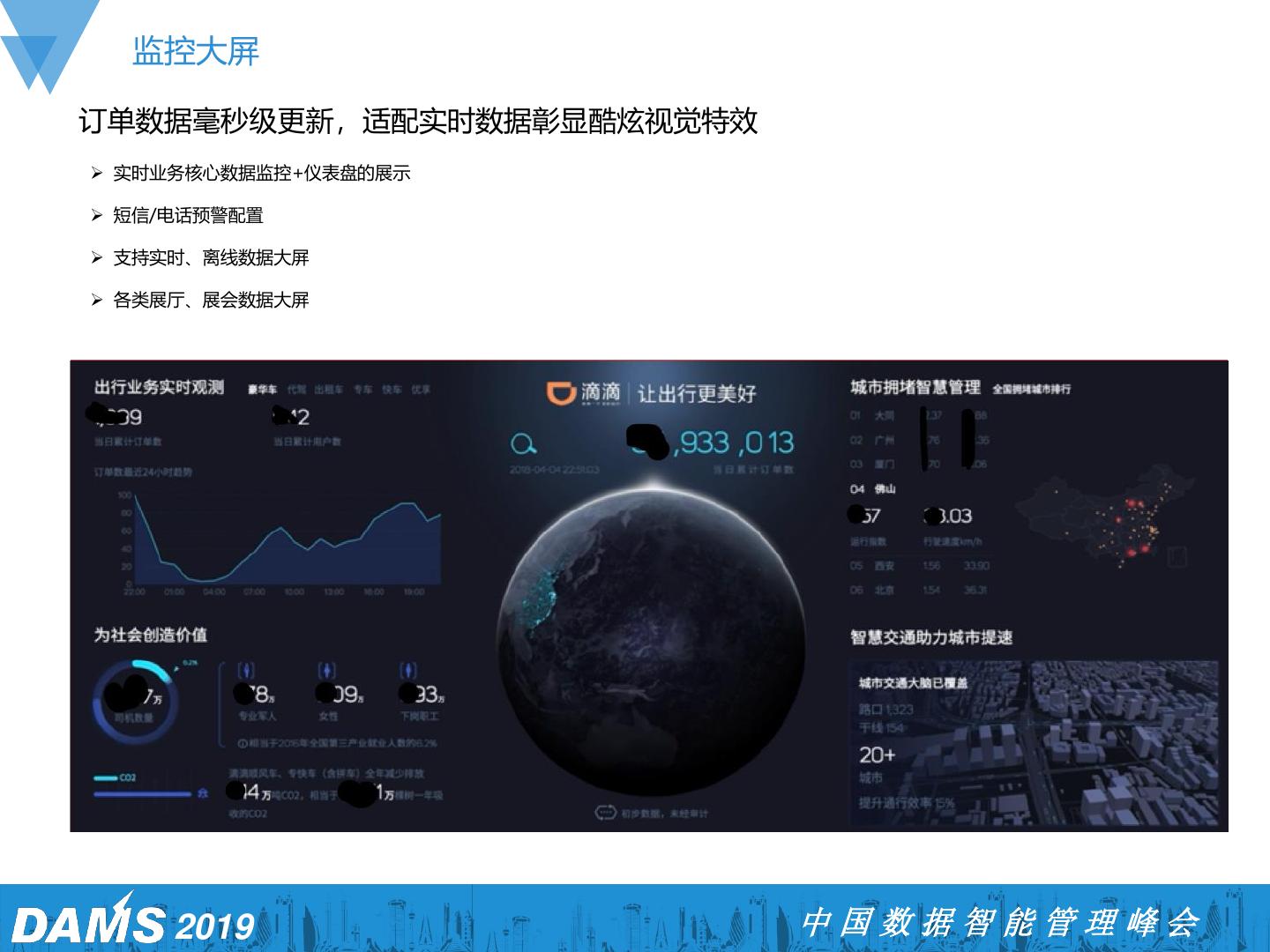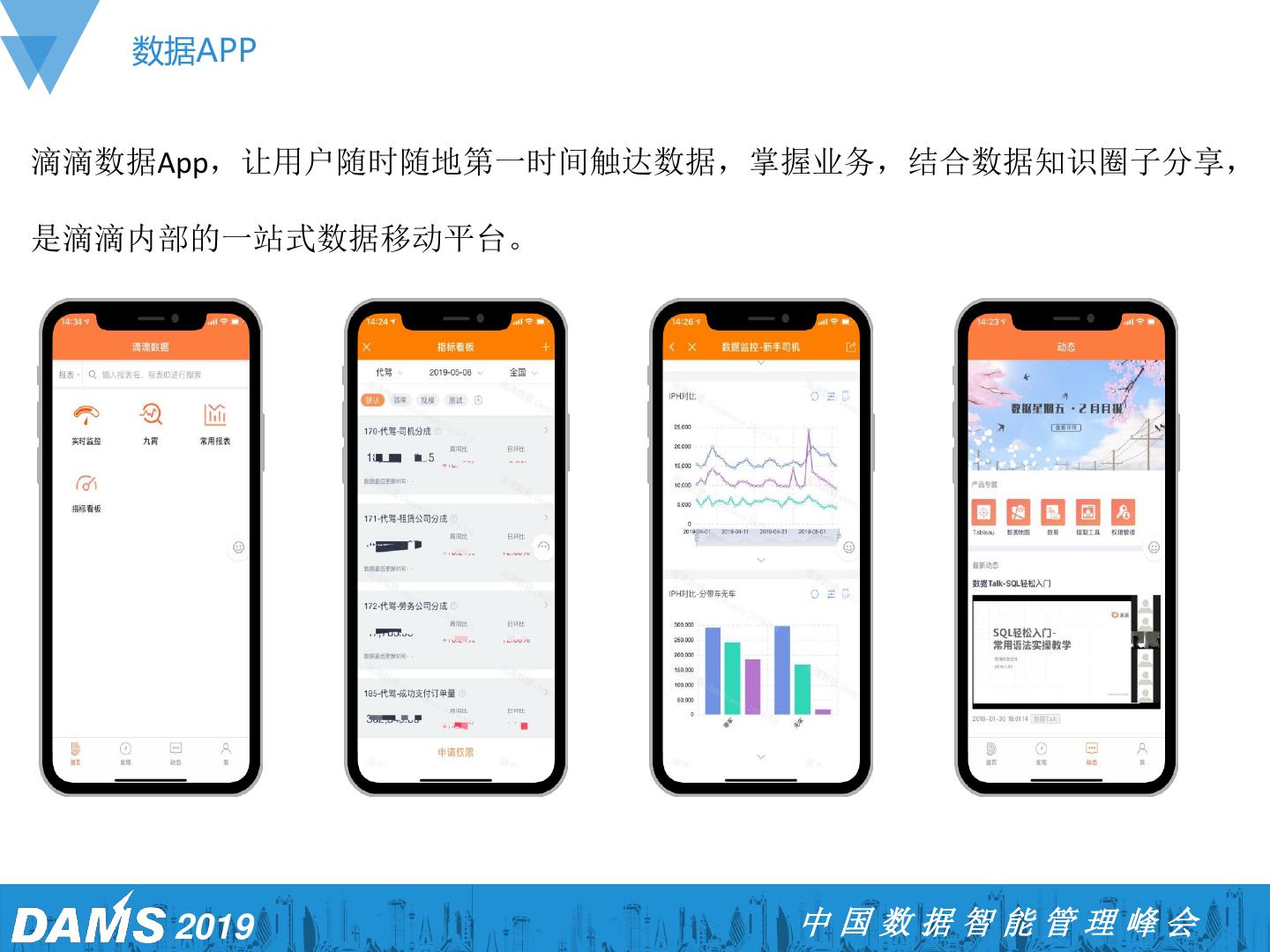 23 . 数据APP 滴滴数据App,让用户随时随地第一时间触达数据,掌握业务,结合数据知识圈子分享, 是滴滴内部的一站式数据移动平台。 2019 中国数据智能管理峰会