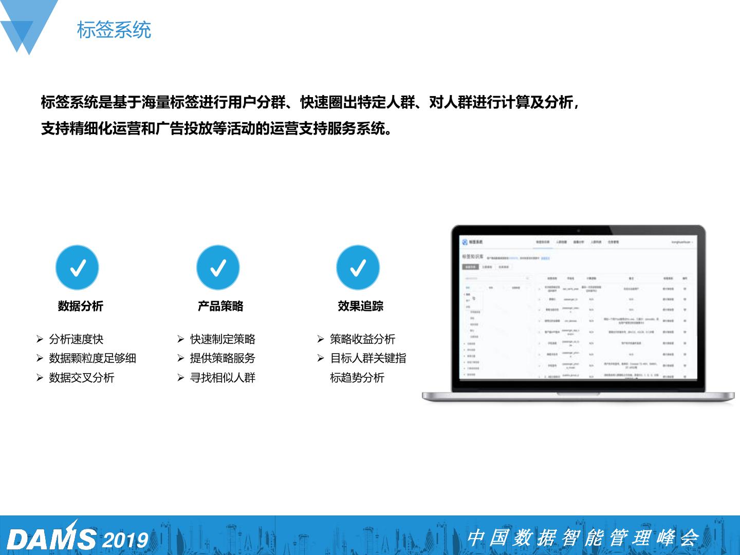 24 . 标签系统 标签系统是基于海量标签进行用户分群、快速圈出特定人群、对人群进行计算及分析, 支持精细化运营和广告投放等活动的运营支持服务系统。 数据分析 产品策略 效果追踪 ➢ 分析速度快 ➢ 快速制定策略 ➢ 策略收益分析 ➢ 数据颗粒度足够细 ➢ 提供策略服务 ➢ 目标人群关键指 ➢ 数据交叉分析 ➢ 寻找相似人群 标趋势分析 2019 中国数据智能管理峰会