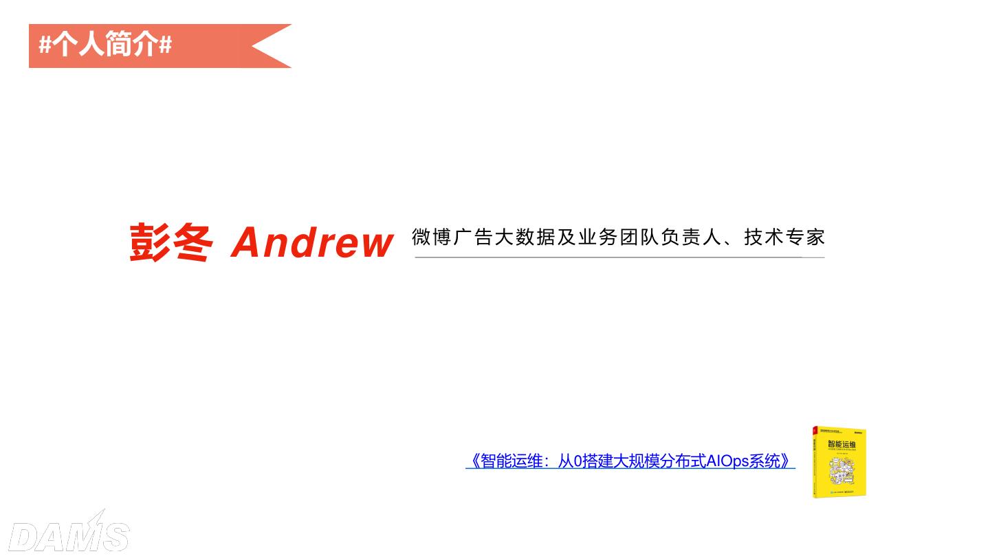 2 .#个人简介# 彭冬 Andrew 微博广告大数据及业务团队负责人、技术专家 《智能运维:从0搭建大规模分布式AIOps系统》