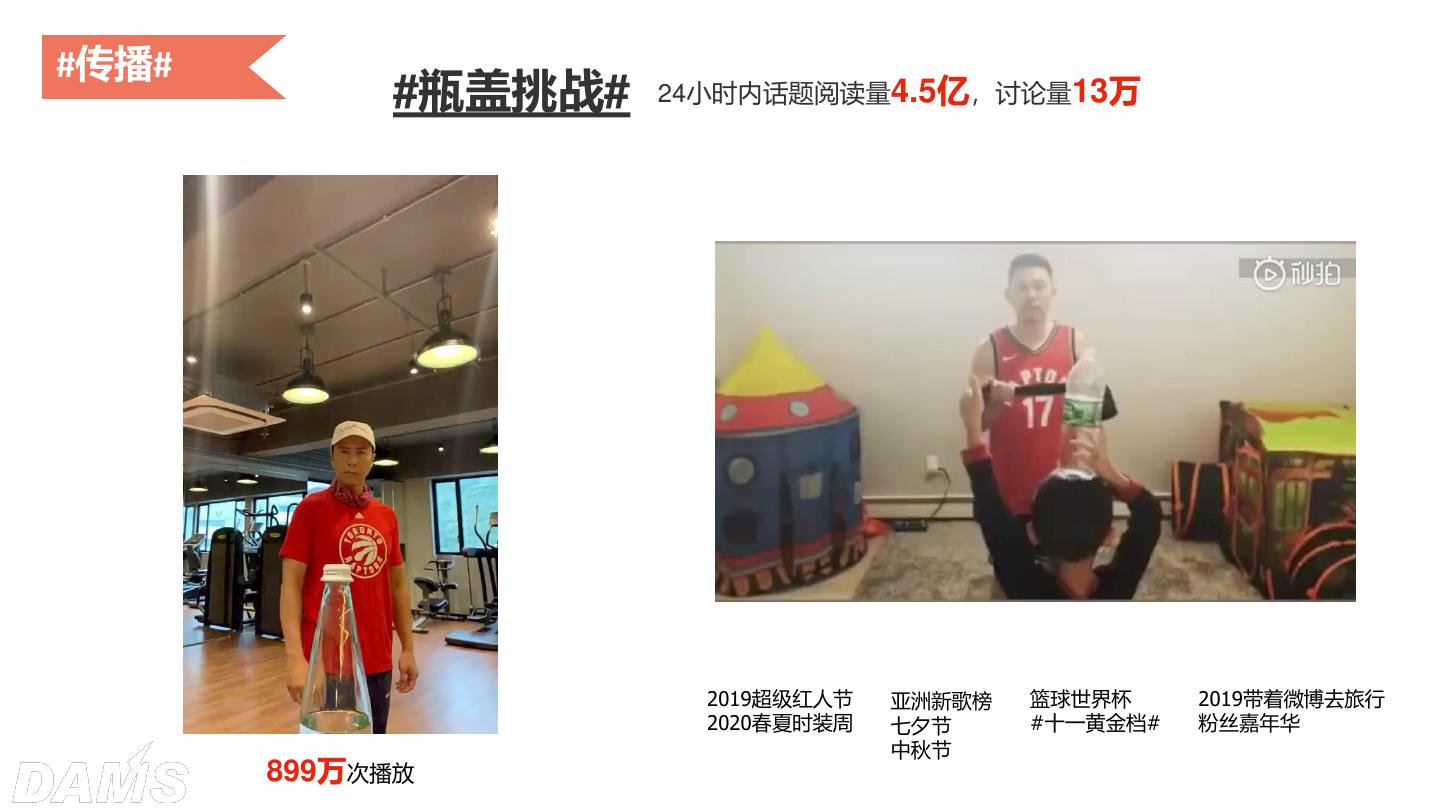 7 .#传播# #瓶盖挑战# 24小时内话题阅读量4.5亿,讨论量13万 2019超级红人节 亚洲新歌榜 篮球世界杯 2019带着微博去旅行 2020春夏时装周 七夕节 #十一黄金档# 粉丝嘉年华 中秋节 899万次播放