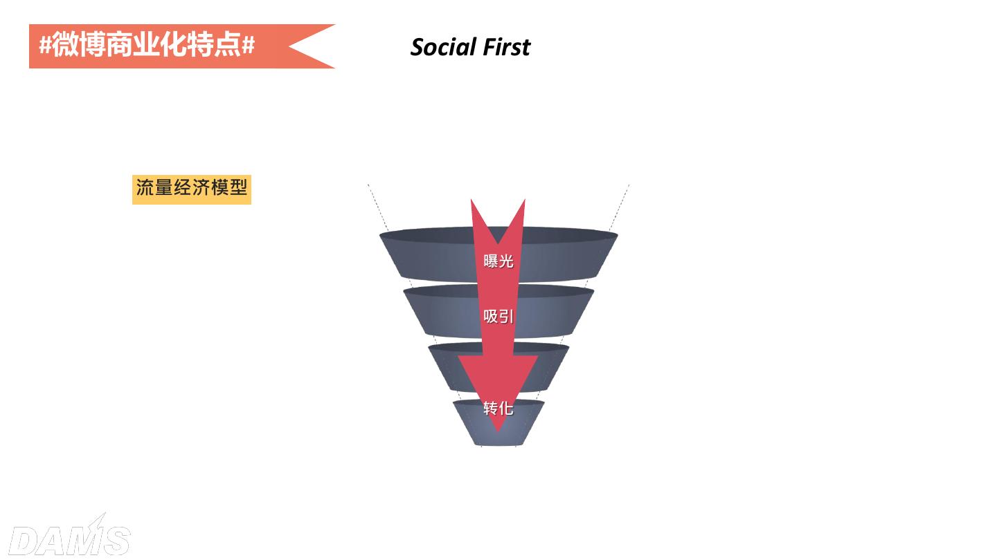 11 .#微博商业化特点# Social First 流量经济模型 曝光 吸引 访问 转化