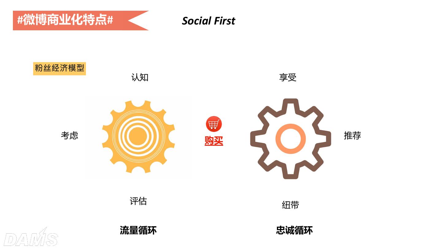 12 .#微博商业化特点# Social First 粉丝经济模型 认知 享受 考虑 推荐 购买 评估 纽带 流量循环 忠诚循环