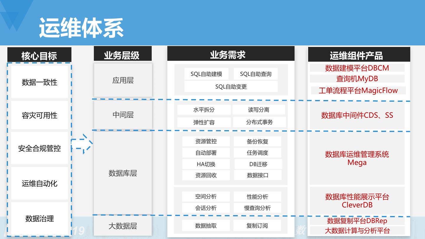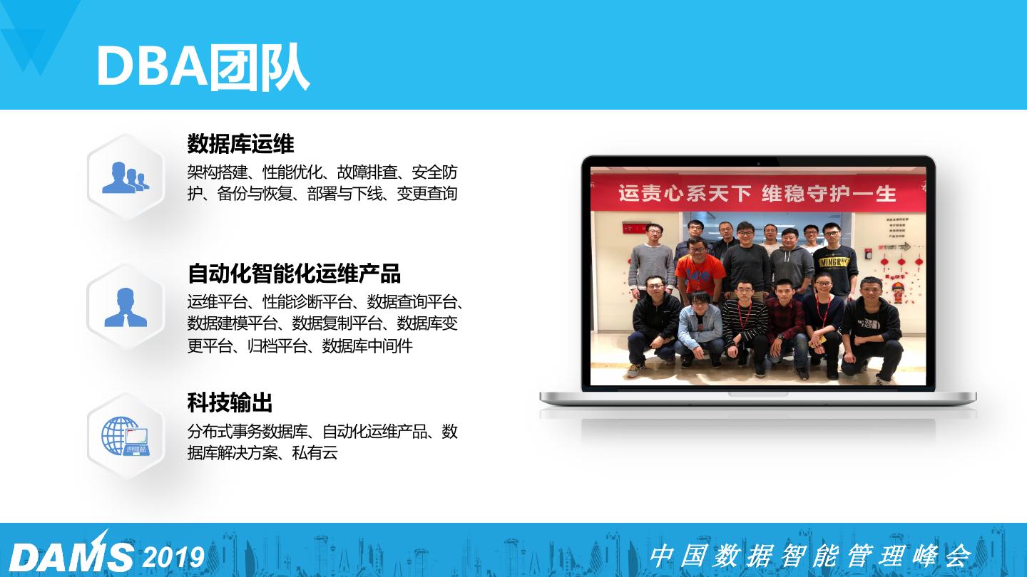 3 .DBA团队 数据库运维 架构搭建、性能优化、故障排查、安全防 护、备份与恢复、部署与下线、变更查询 自动化智能化运维产品 运维平台、性能诊断平台、数据查询平台、 数据建模平台、数据复制平台、数据库变 更平台、归档平台、数据库中间件 科技输出 分布式事务数据库、自动化运维产品、数 据库解决方案、私有云 2019 中国数据智能管理峰会