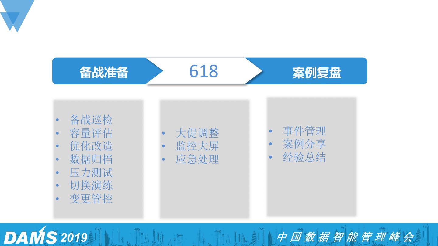 6 . 备战准备 618 案例复盘 • 备战巡检 • 容量评估 • 大促调整 • 事件管理 • 优化改造 • 监控大屏 • 案例分享 • 数据归档 • 应急处理 • 经验总结 • 压力测试 • 切换演练 • 变更管控 2019 中国数据智能管理峰会