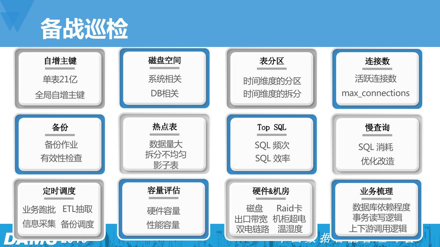 7 . 备战巡检 自增主键 磁盘空间 表分区 连接数 单表21亿 系统相关 时间维度的分区 活跃连接数 全局自增主键 DB相关 时间维度的拆分 max_connections 备份 热点表 Top SQL 慢查询 备份作业 数据量大 SQL 频次 SQL 消耗 有效性检查 拆分不均匀 SQL 效率 影子表 优化改造 定时调度 容量评估 硬件&机房 业务梳理 业务跑批 ETL抽取 硬件容量 磁盘 Raid卡 数据库依赖程度 出口带宽 机柜超电 事务读写逻辑 信息采集 备份调度 性能容量 双电链路 温湿度 上下游调用逻辑 2019 中国数据智能管理峰会