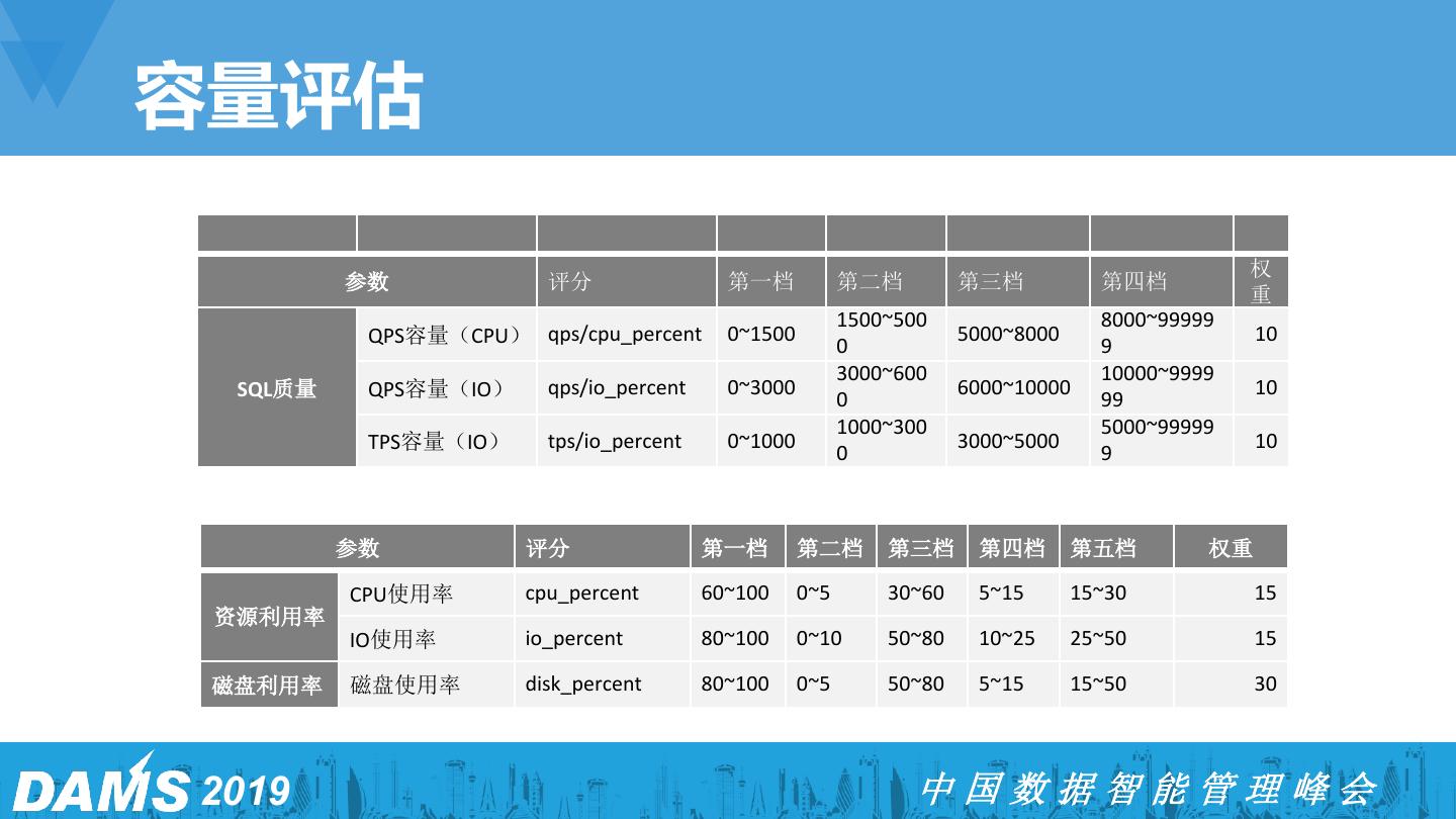 9 .容量评估 权 参数 评分 第一档 第二档 第三档 第四档 重 1500~500 8000~99999 QPS容量(CPU) qps/cpu_percent 0~1500 0 5000~8000 9 10 3000~600 10000~9999 SQL质量 QPS容量(IO) qps/io_percent 0~3000 6000~10000 10 0 99 1000~300 5000~99999 TPS容量(IO) tps/io_percent 0~1000 3000~5000 10 0 9 参数 评分 第一档 第二档 第三档 第四档 第五档 权重 CPU使用率 cpu_percent 60~100 0~5 30~60 5~15 15~30 15 资源利用率 IO使用率 io_percent 80~100 0~10 50~80 10~25 25~50 15 磁盘利用率 磁盘使用率 disk_percent 80~100 0~5 50~80 5~15 15~50 30 2019 中国数据智能管理峰会