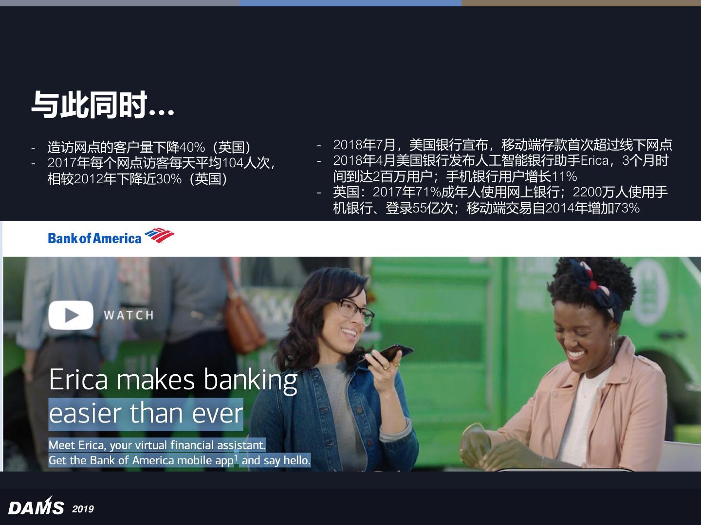 2 .“数字化颠覆终于来到了银行业” - 手机银行用户到达“关键多数”:美国市场 49%的人通过手机处理日常银行事务 - 科技企业进军金融:苹果与高盛发行“智能” 信用卡 - iPhone就是你的信用卡; Facebook要变身“微信支付” - 关闭分行网点、取替Mainframe:全球上市 银行共同裁减三分之一的成本,即等同于 为地球上每一个人每年增加80美元存款 《经济学人》2019年5月2日版 2019