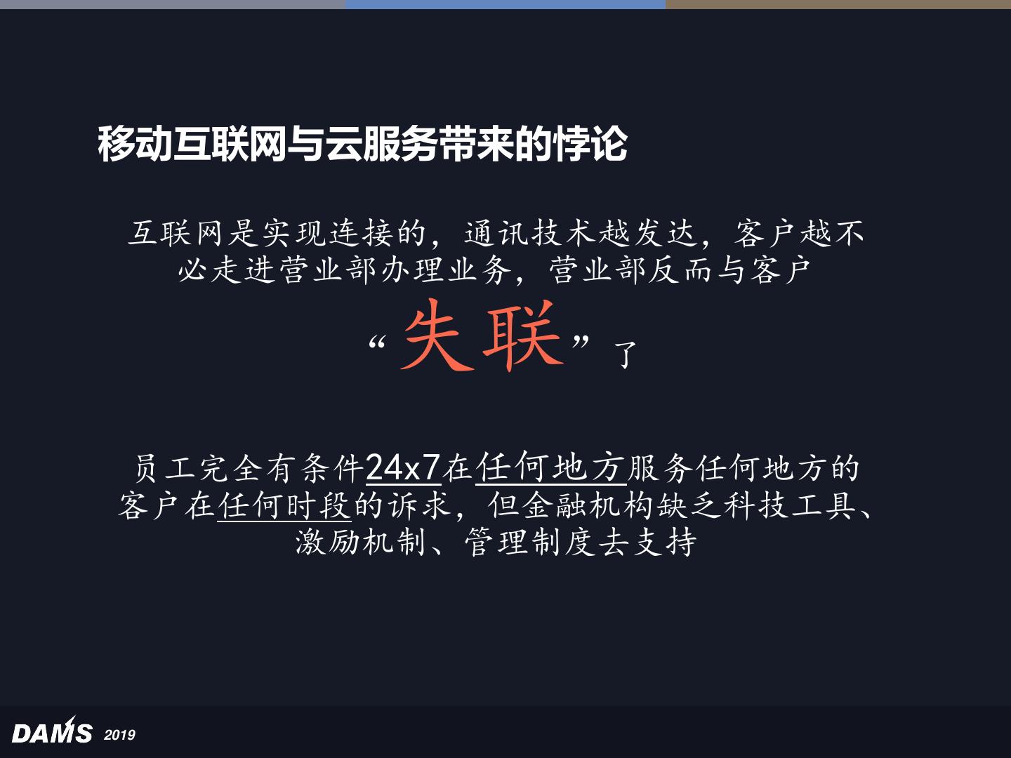 9 .移动互联网与云服务带来的悖论 互联网是实现连接的,通讯技术越发达,客户越不 必走进营业部办理业务,营业部反而与客户 “ 失联” 了 员工完全有条件24x7在任何地方服务任何地方的 客户在任何时段的诉求,但金融机构缺乏科技工具、 激励机制、管理制度去支持 2019