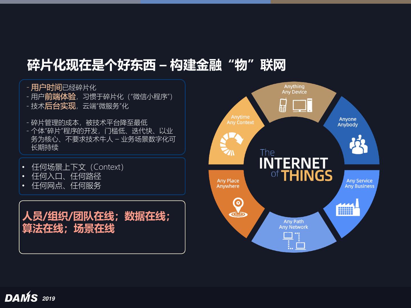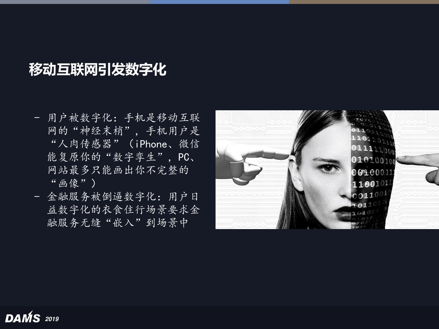 11 .移动互联网引发数字化 - 用户被数字化:手机是移动互联 网的“神经末梢”,手机用户是 “人肉传感器”(iPhone、微信 能复原你的“数字孪生”,PC、 网站最多只能画出你不完整的 “画像”) - 金融服务被倒逼数字化:用户日 益数字化的衣食住行场景要求金 融服务无缝“嵌入”到场景中 2019
