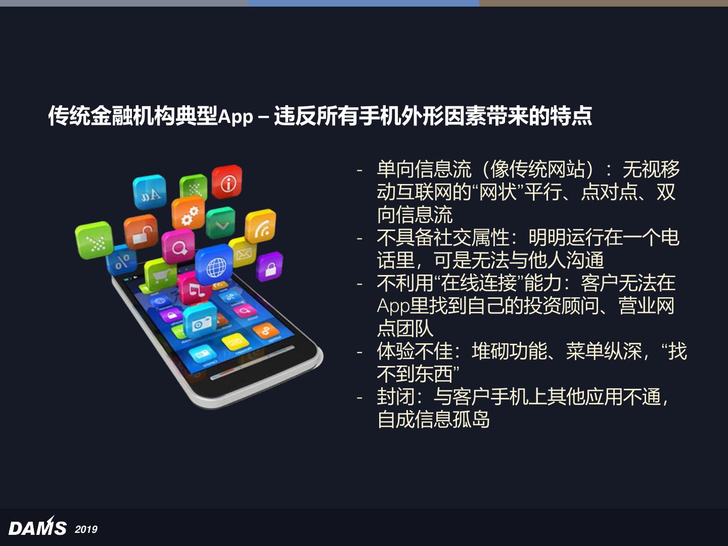 16 .传统金融机构典型App – 违反所有手机外形因素带来的特点 - 单向信息流(像传统网站):无视移 动互联网的“网状”平行、点对点、双 向信息流 - 不具备社交属性:明明运行在一个电 话里,可是无法与他人沟通 - 不利用“在线连接”能力:客户无法在 App里找到自己的投资顾问、营业网 点团队 - 体验不佳:堆砌功能、菜单纵深,“找 不到东西” - 封闭:与客户手机上其他应用不通, 自成信息孤岛 2019