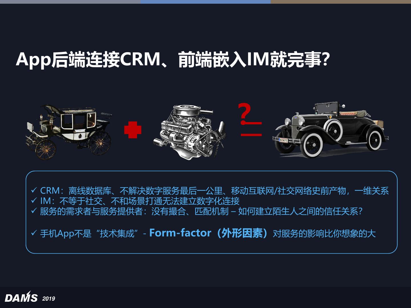 18 .App后端连接CRM、前端嵌入IM就完事? ? = ✓ CRM:离线数据库、不解决数字服务最后一公里、移动互联网/社交网络史前产物,一维关系 ✓ IM:不等于社交、不和场景打通无法建立数字化连接 ✓ 服务的需求者与服务提供者:没有撮合、匹配机制 – 如何建立陌生人之间的信任关系? ✓ 手机App不是“技术集成”- Form-factor(外形因素)对服务的影响比你想象的大 2019